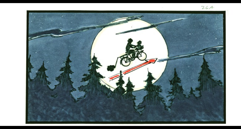 Another bit of art below gives us a look at the earlier moment when E.T. and his human friend Elliott take to the sky, flying in front of the moon. This is probably the most famous image from "E.T.," and one of the most famous images in the history of film. It would, of course, become the logo for Spielberg's production company, Amblin.