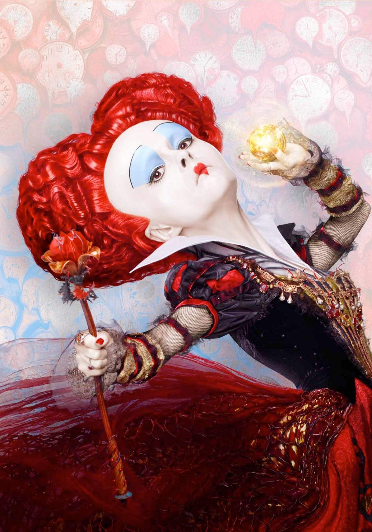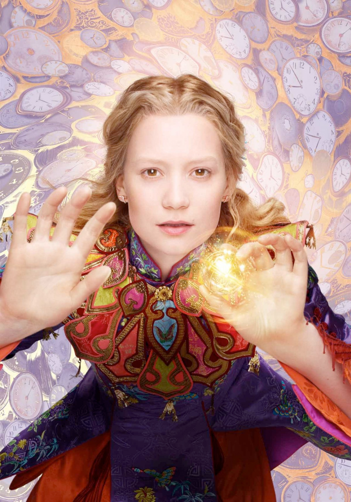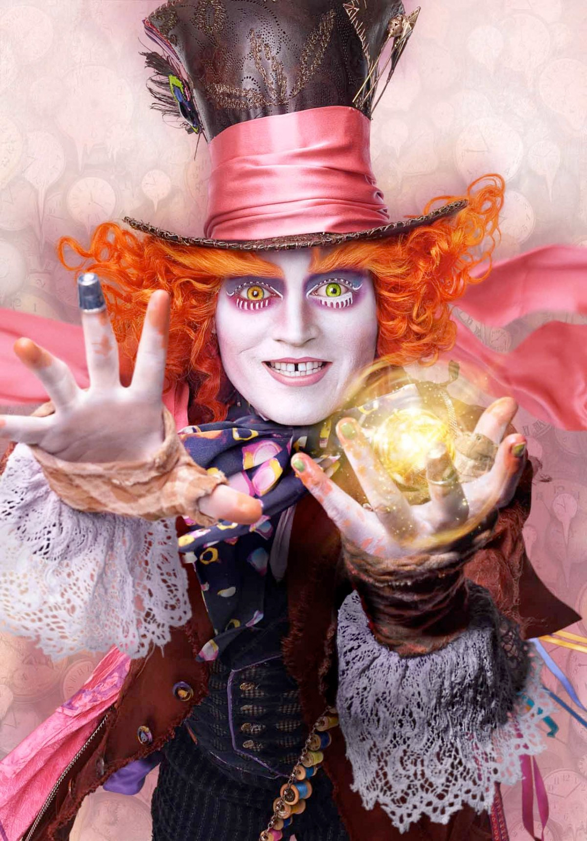 What's interesting about these posters is each of the characters is holding the same glowing gold orb, looking almost like a Golden Snitch from Harry Potter. However, whatever this item is, it isn't spotted in the teaser trailer anywhere. So what could it be? My best guess is that it's the MacGuffin that must be recovered in order to turn back time. That's what Alan Rickman's voiceover as the blue caterpillar Absolem says Alice must do, and this device must be the key to achieving that if all the characters are featured with it.