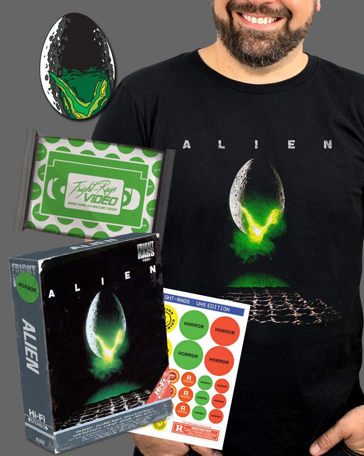 You want some fabric to cover your torso? You're in luck, because both Fox and Fright-Rags are offering you some shirts, baby! The Fox shirts, which you can scoop up here, come with trading cards. The shirts from Fright-Rags offers a "Video Series Box Set" that comes with "a super-soft black tee with the iconic ALIEN cover art, a glow-in-the-dark first-pressing Enamel Pin, Fright-Rags Microwave Popcorn and a VHS Sticker Sheet! All packaged inside a Collector Box designed to mimic the original VHS sleeve."