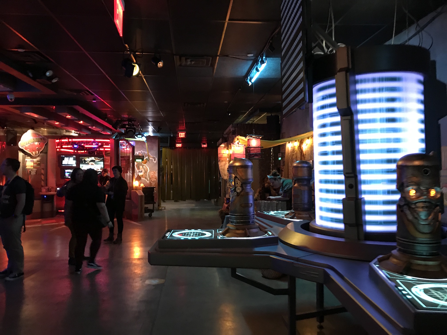 Walking into the 12,000-square foot "market," the attention to detail is immediately apparent — rusty pipes snake around the walls of the warehouse, peeling signs advertise the utopian floating city of Zalem, bright fabrics drape the eight booths that each offer different "games" to visitors. In one booth, you search for outlaws on a group of security monitors, in another you attempt to guess the smells in various vials. In yet another you can play a game of musical whack-a-mole, in which your team of six man the rickety keyboards and drums that light up. The doctor in one booth flirts with you while testing your team's camaraderie through a series of hand-eye coordination tasks. But apart from the standing booths, Passport to Iron City also offers an inscrutable sidequest which requires you to solve a series of puzzles hidden throughout the market.