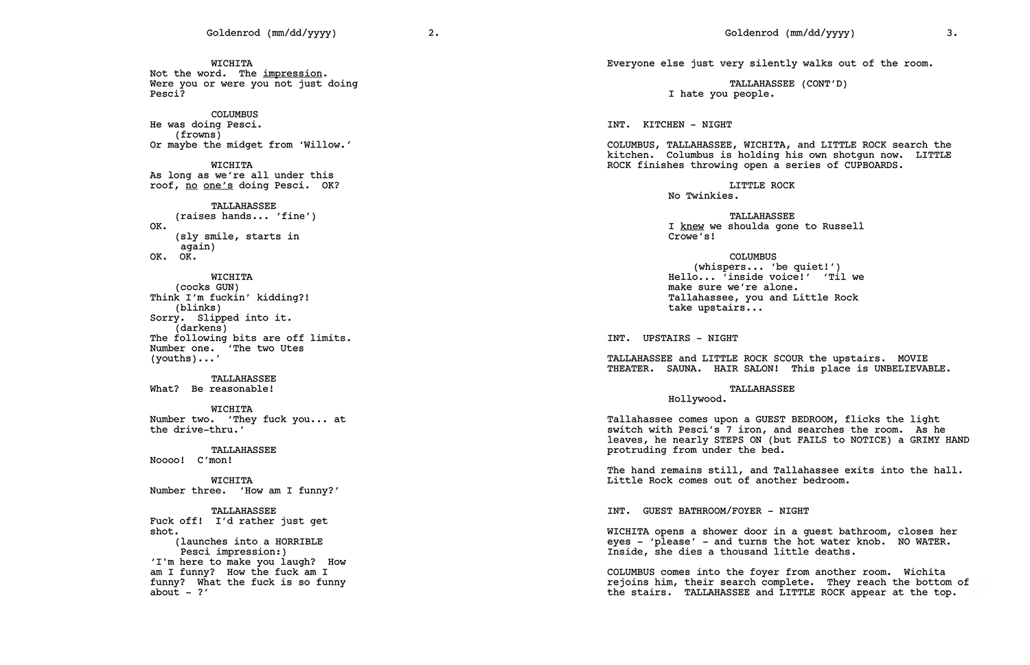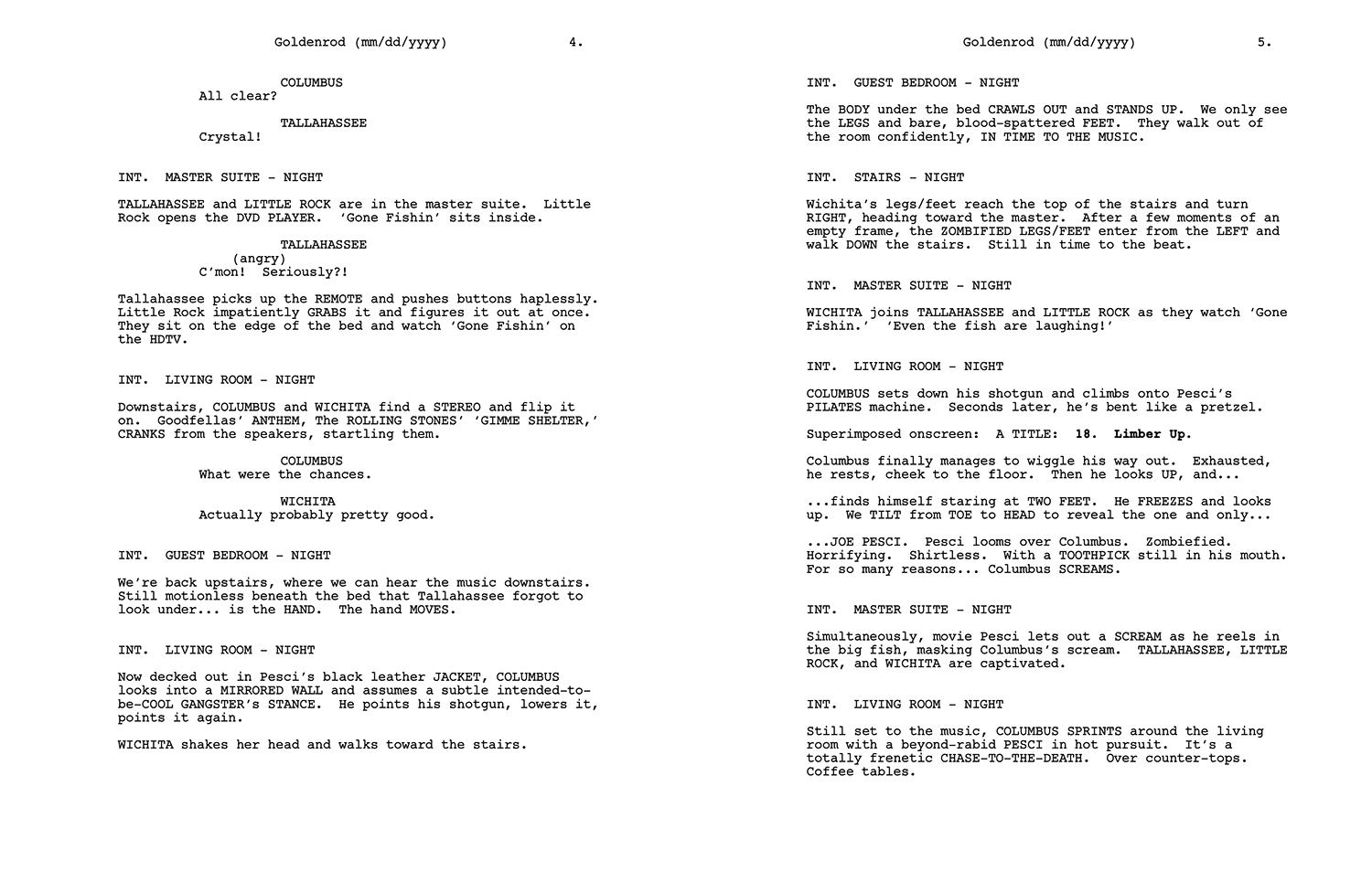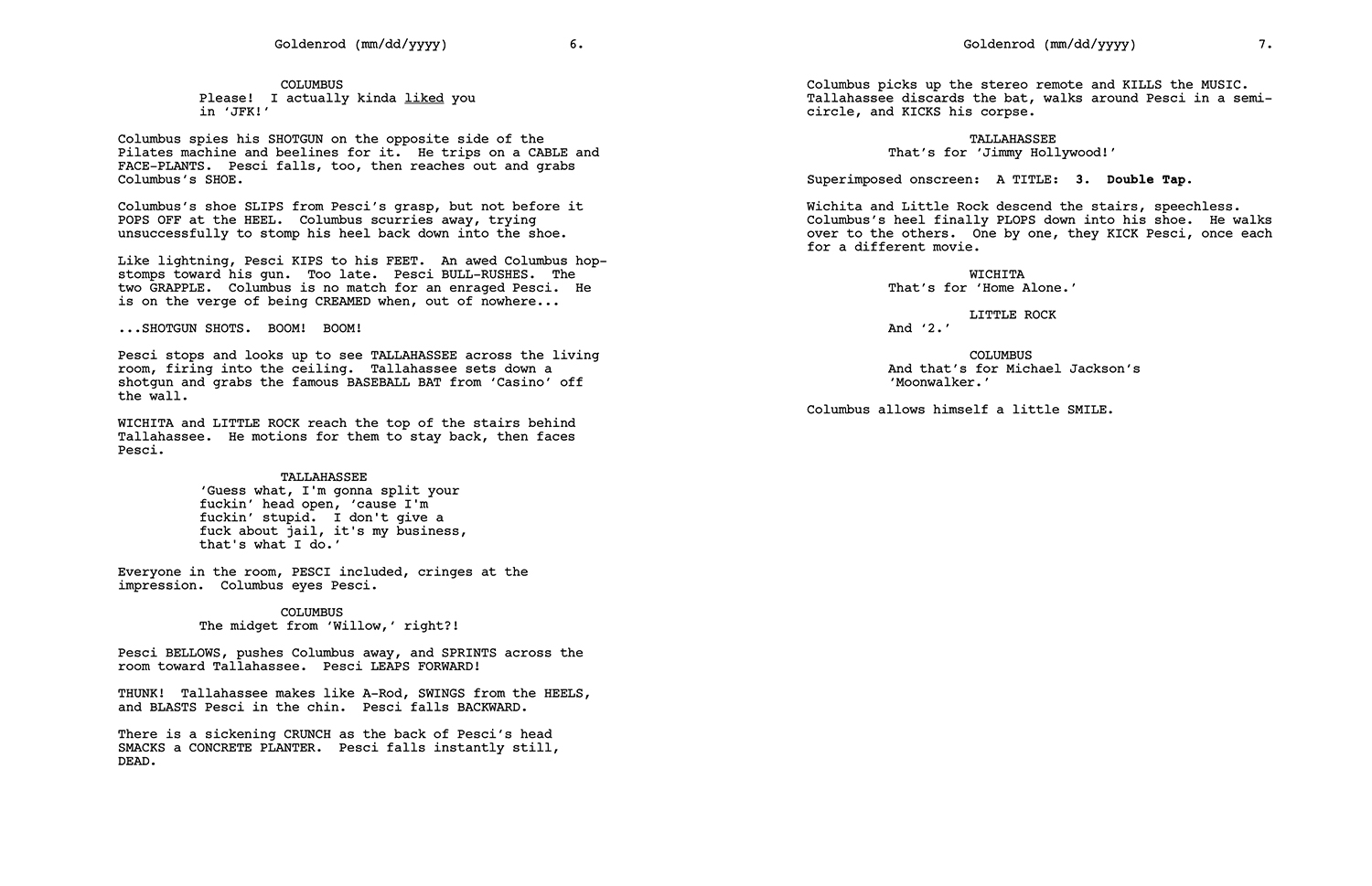The pages for what would have been Joe Pesci's cameo in Zombieland again echo the style of Patrick Swayze's original cameo, but there are merely references to Joe Pesci's movies instead. The one big change comes in Tallahassee's love for Pesci never waning in any capacity. In all the other versions of this scene, Tallahassee had a reason to lose his respect and love for Swazye, Stallone and Mark Hamill. But there's none of that with Joe Pesci. Also, this draft represents the first time that the movie still in the DVD player is actually one of the actor's bad movies: Gone Fishin'
