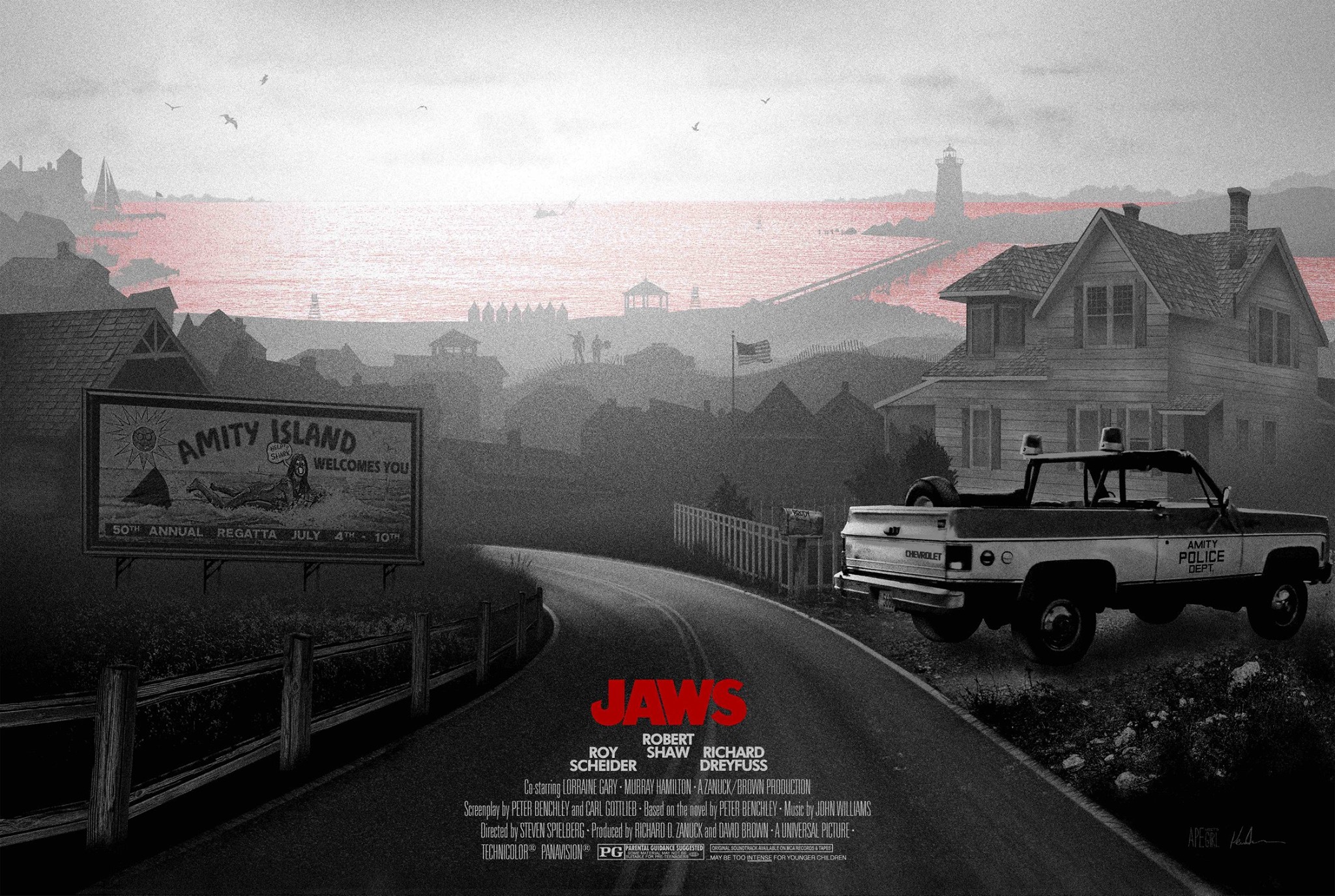 I think you'll all agree Kevin has knocked these out of the park (or sea) to show a very different side of Amity that has yet been seen in print form. The key focus was the town of Amity and to reference the sign in a way that it welcomes you into the town before and after the shark attack. The prints are full of film references and easter eggs from the Reservoir that Police Chief Brody sends his son to play in, to his house (and letter box), the broken fence to the detail on the beach and buoy in the sea and not forgetting the sign. There may also be an appearance from Jaws himself in one form or another for those who are eagle eyed...there's more than one shark reference.