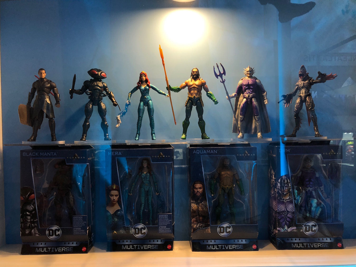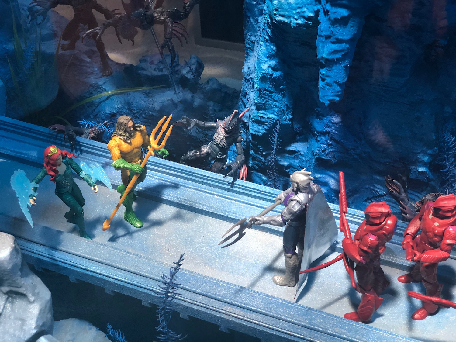 These toy displays show Aquaman almost exclusively in his classic comic-book outfit — bright yellow shirt, neon green pants, giant green gauntlets — save for the black underwear. This is a stark contrast to how we've seen Aquaman until now; in Justice League and in stills for his upcoming solo movie, Momoa is usually seen shirtless covered in his Polynesian tattoos or clad in his gold and green armor. Will he get an outfit change midway through the film that will result in him wearing the cheery classic costume we know and love (and sort of make fun of)? Hopefully that will be the case — it's a good way to distinguish Aquaman from the dark, desaturated grittiness that the DC Extended Universe has introduced so far, and is perhaps another sign of a tonal shift for the cinematic universe. They're comic book characters – let them go full comic book.
