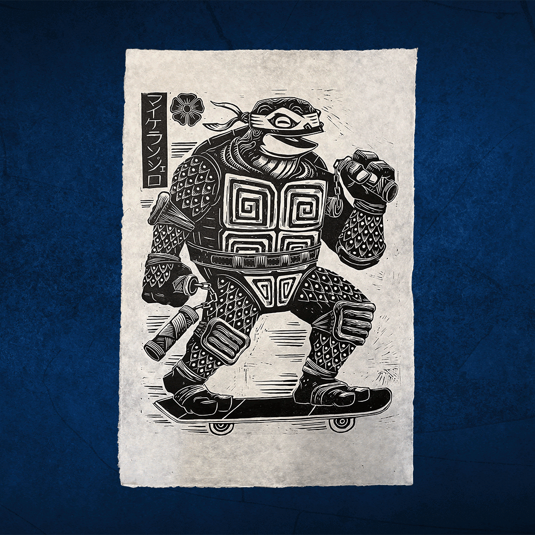 These are what are known as linoleum block prints, which are created by using a printmaking technique where the image is carved out of a sheet of linoleum and then impressed on to paper by either hand or machine. For these four prints, Attack Peter designed, carved, and printed each piece by hand, using a roller to apply ink to the linoleum and then printing each directly to achieve his signature style. You can see how it works right here: