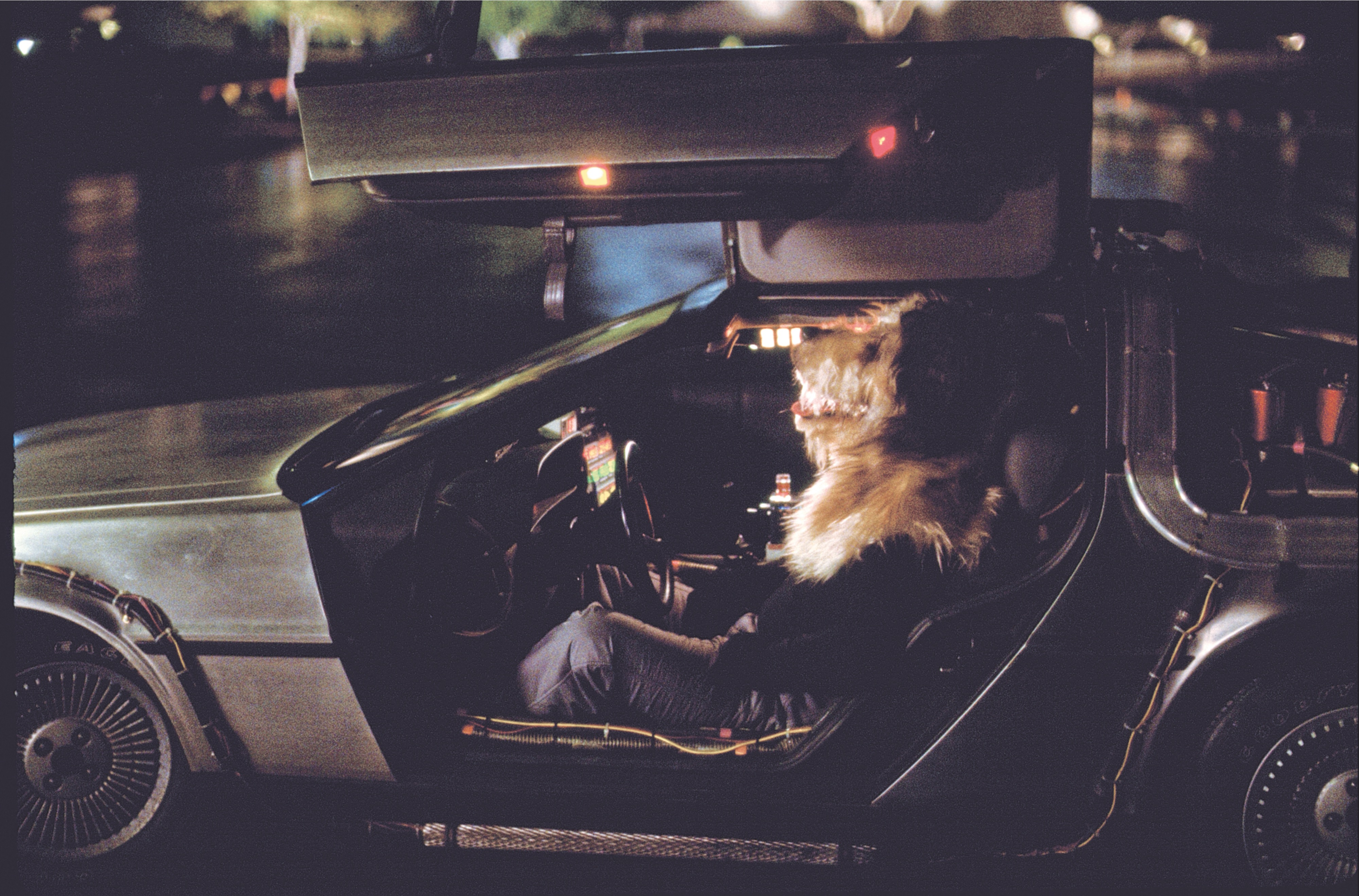 Well, it seems I was wrong on both accounts. The book reveals a couple photos, one seen above, of stuntman Dick Butler donning a full-sized dog costume to take the wheel during the sequence. The scene was actually also Michael J. Fox's first day on set, and the book reveals that the remote control prop needed to be replaced with a stand-by duplicate, as Christopher Lloyd snapped off a switch when he was putting a little too much energy in his performance.