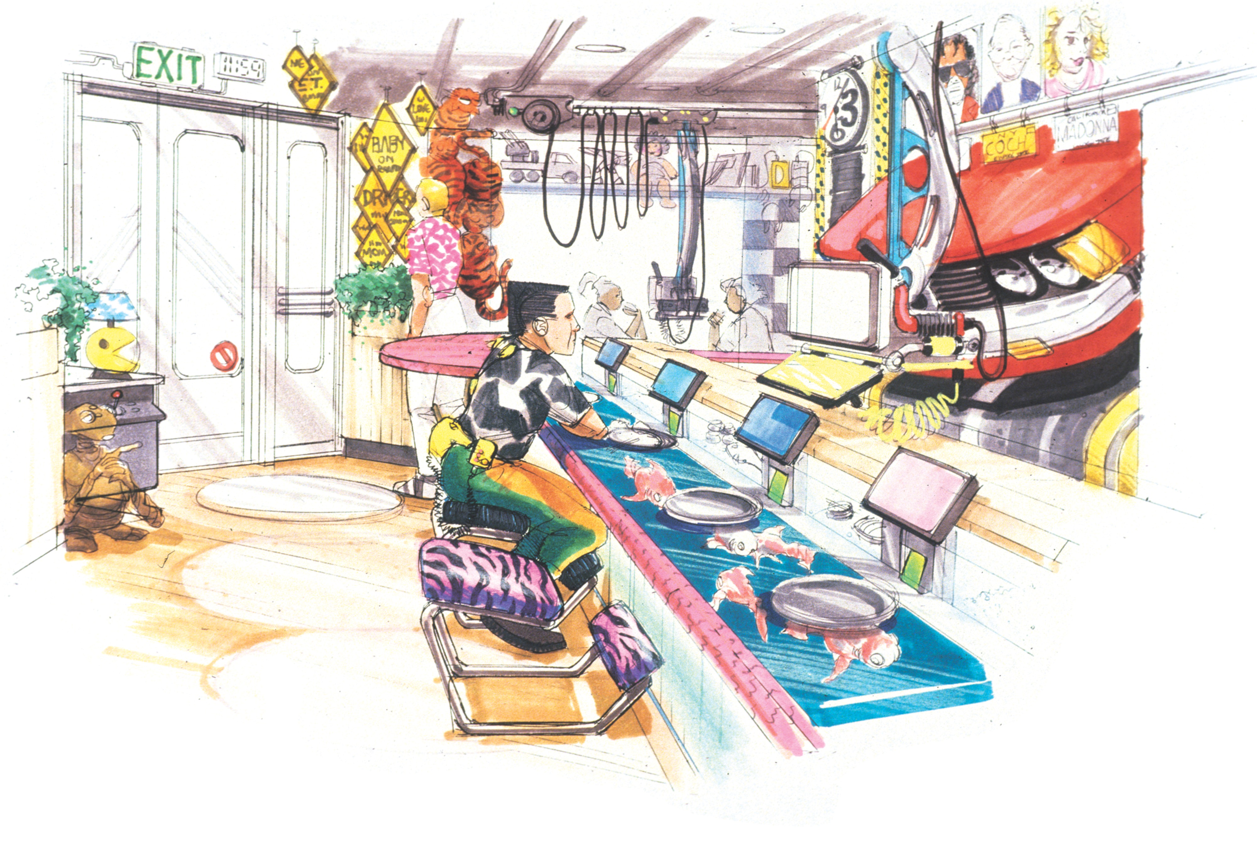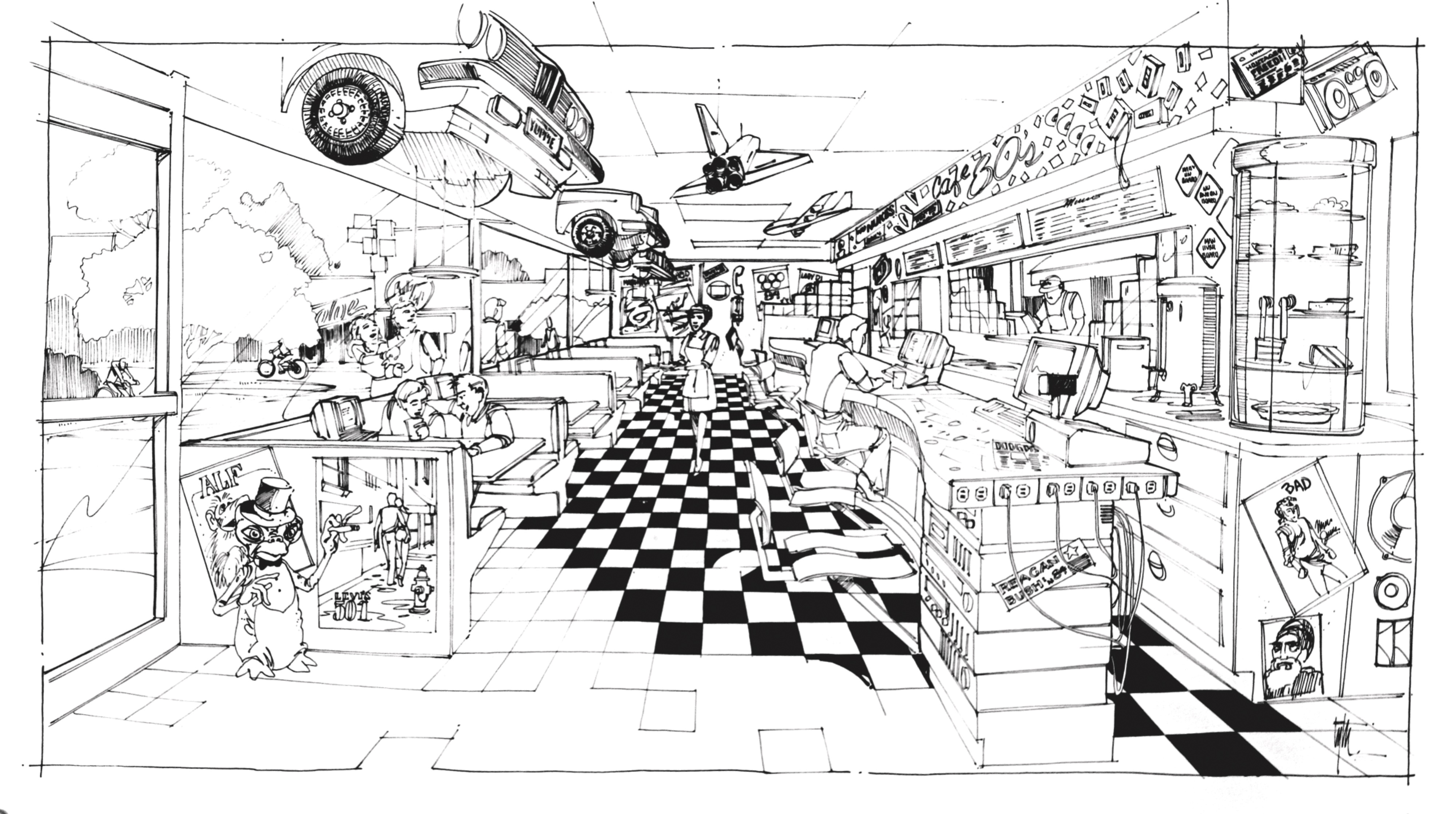 Okay, so these pieces of Cafe 80's concept art might not be mind-blowing, but they are just cool. It's interesting to see how the idea for a futuristic '50s-style cafe evolved into what it turned out to be in the film. Ed Eyth did the sketch, while John Bell did the colored versions to the right. According to the book, the idea for the Cafe 80's came from director Robert Zemeckis, but I've heard writer Bob Gale talk many times about how he envisioned that the people of 2015 would be nostalgic for an era 30 years earlier.