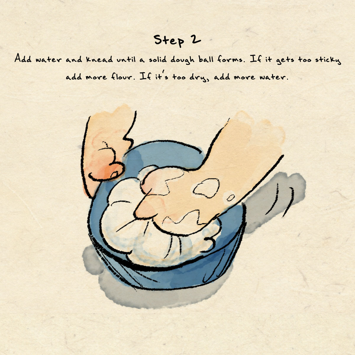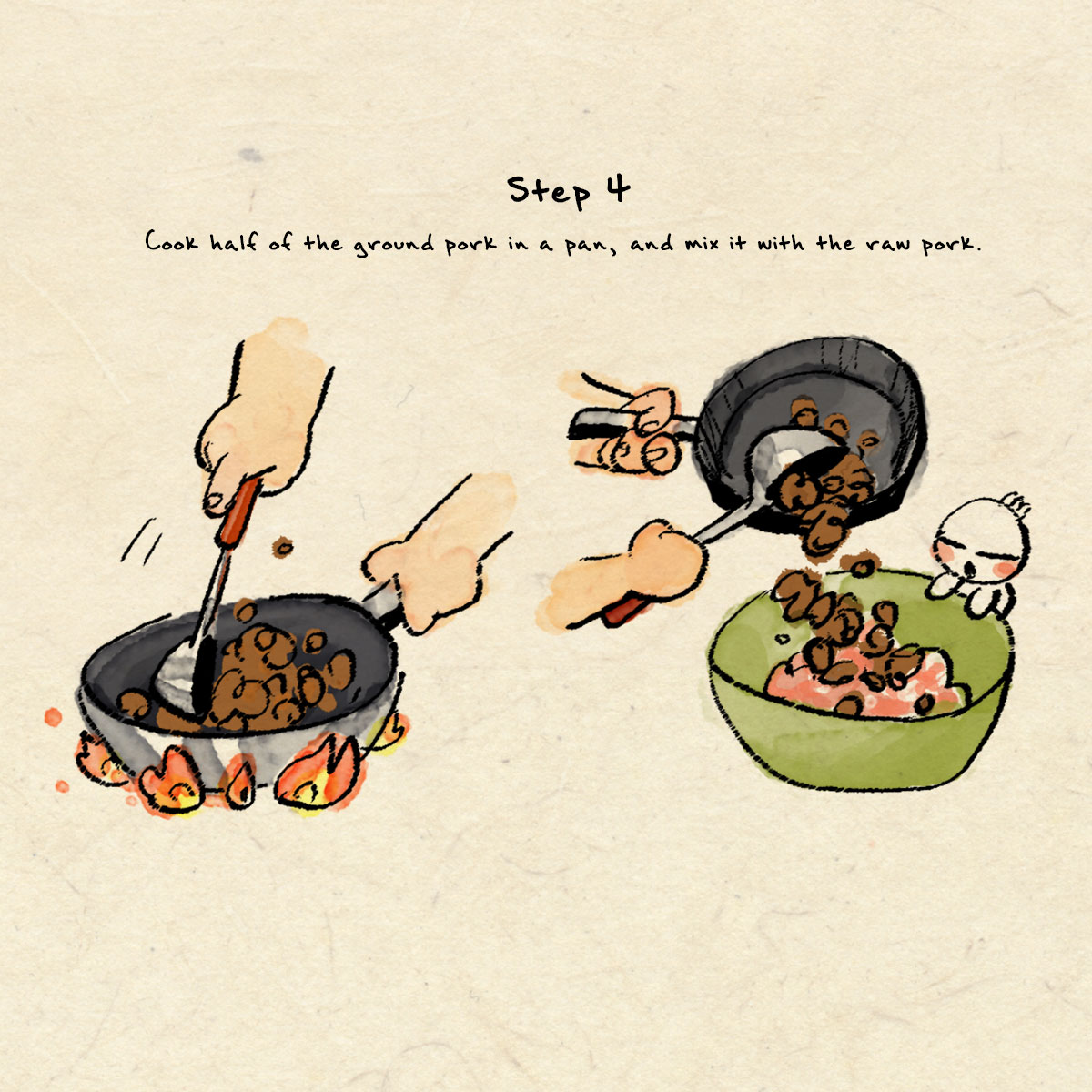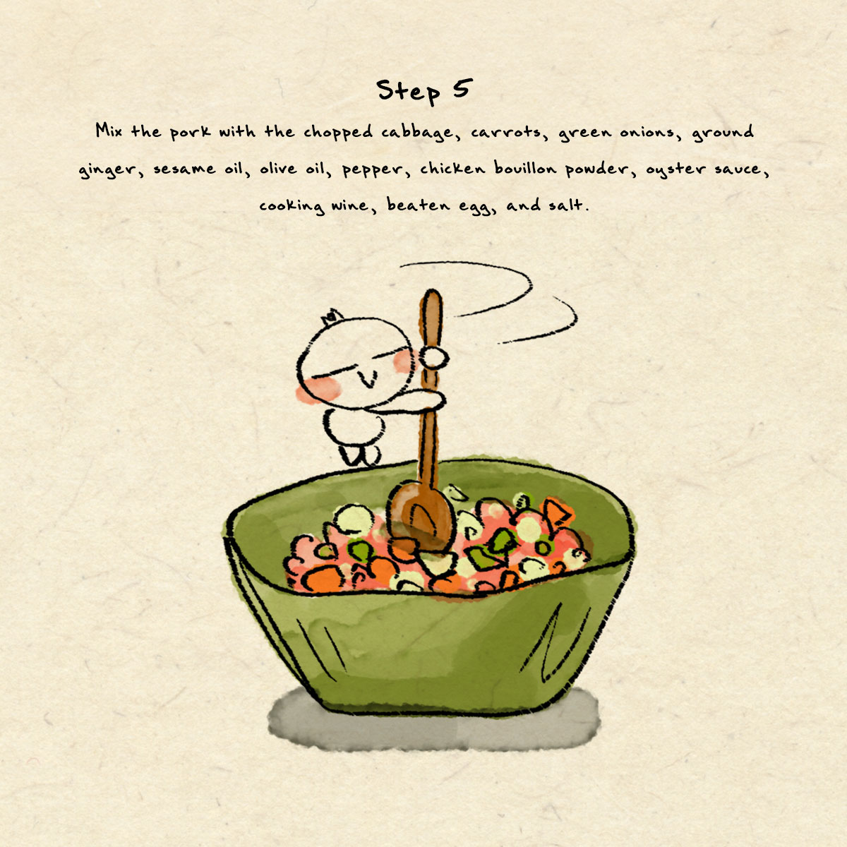 Ingredients you need: flour, dry yeast, water for the dough; for the filling: ground pork, Chinese cabbage, carrots, onion stalks, an egg, ground ginger, olive oil, chicken bouillon powder, oyster sauce, cooking wine, and pepper.Step 1: Mix the flour and yeast in a mixing bowl.Step 2: Add water and knead.Step 3: Let the dough rest and rise.Step 4: Cook half the pork in a pan and mix it with the raw meat.Step 5: Mix it up with all the other ingredients (vegetables chopped, eggs beaten) and a healthy dosing of salt.Step 6: Roll out the dough using Domee Shi's mom's signature windmill technique.Step 7: Cut the dough into half-inch pieces and roll these out to form wrappers.Step 8: Fill the wrappers and pinch.Step 9: Place the dumplings in a steamer basket lined with cabbage leaves and place on top of a bot of boiling water for 5 minutes.Step 10: Eat or adopt your dumpling as you see fit.