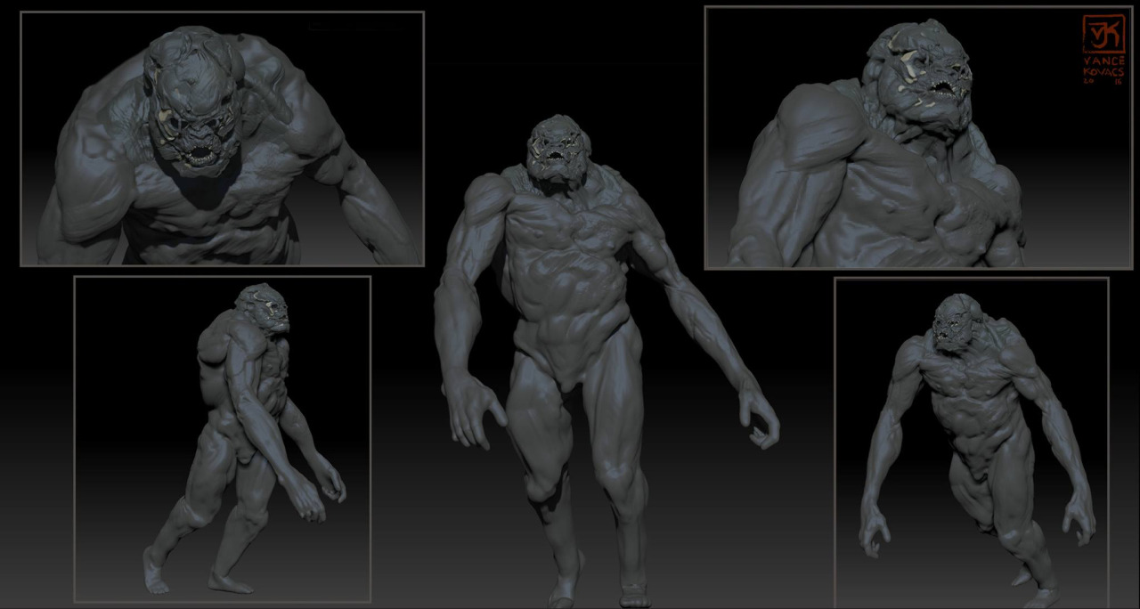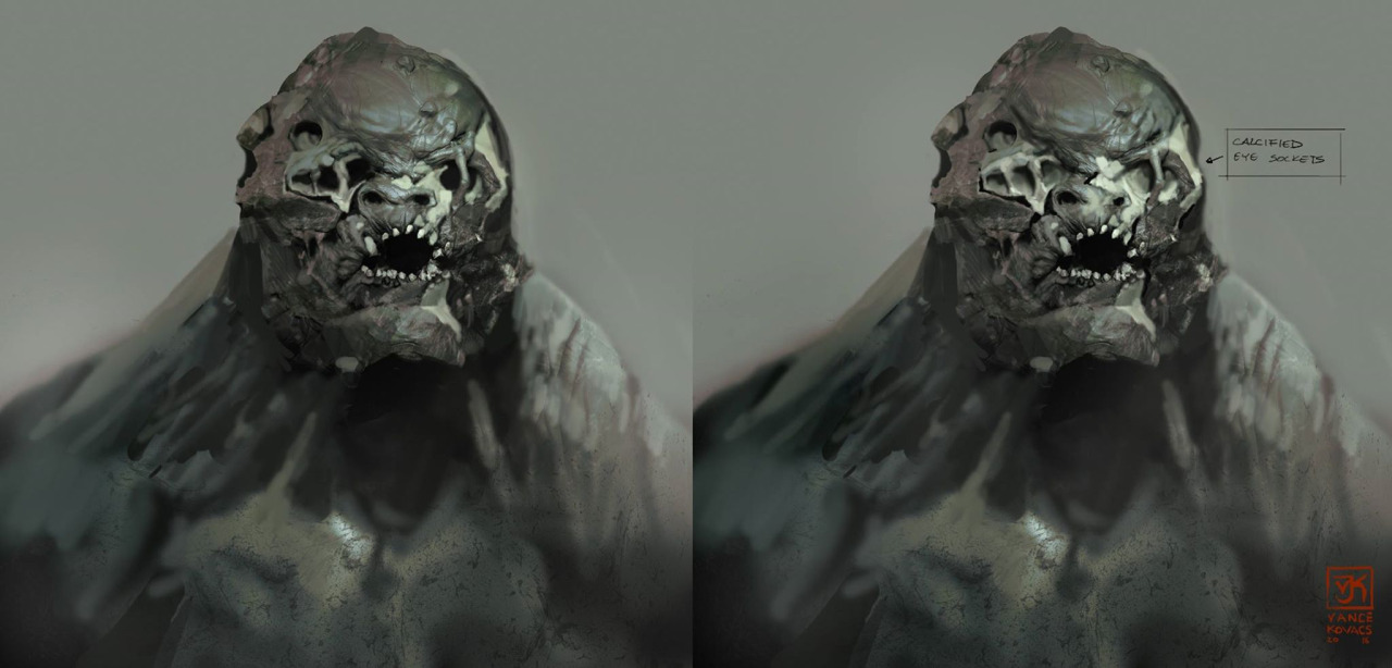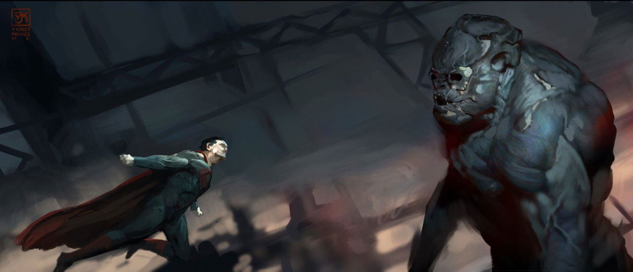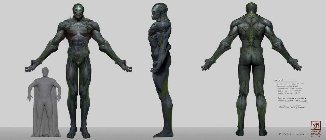 But like all superhero movie characters (heck, like just about any movie character), he went through more than a few iterations before director Zack Snyder and his team landed on that final design. Concept artist Vance Kovacs has released a batch of concept art to show off a few alternate takes on the character and they all follow the same basic pattern: hulking grey thing with a messed-up face and twisted, muscular body that towers over Superman, Batman and Wonder Woman. I personally prefer a few of these to final version, especially the ones that look truly alien and bizarre. The fact that Doomsday looks so familiar to so many other major CGI baddies in the final film is a bit of a shame, especially when there were so many other options available.