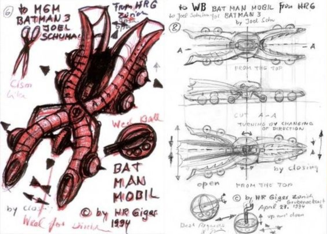 As you can see from the top left corner, Giger took his inspiration from a pair of scissors; I suppose he envisioned Batman literally cutting through crime in Gotham City. It's a horrifying mixture of mechanical tubes and phallic imagery, very clearly from the same mind as the man behind Jodorowsky's unmade version of Dune and Scott's Alien.