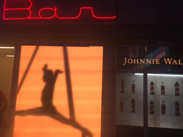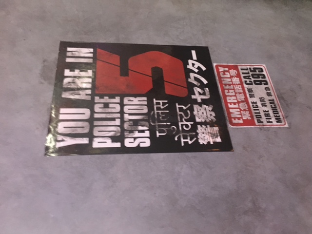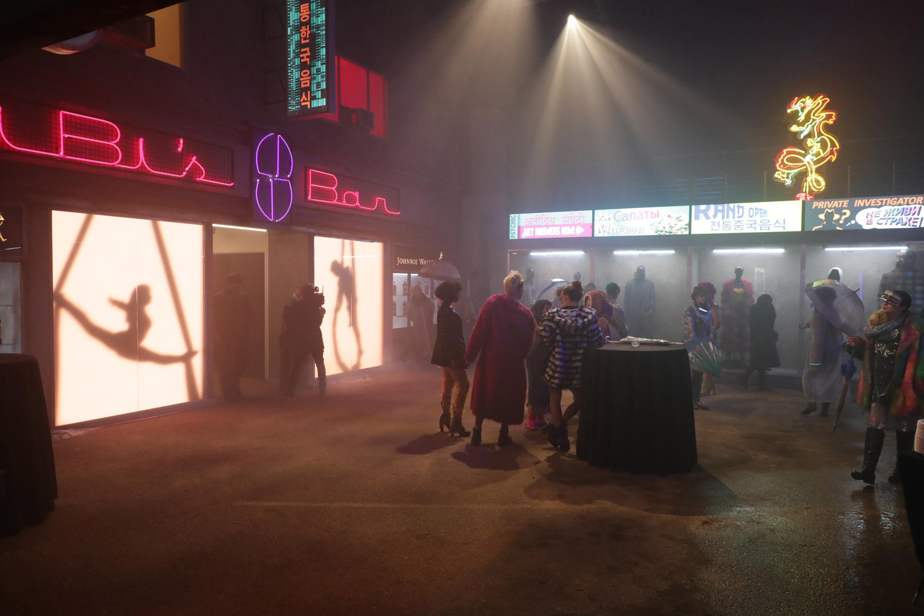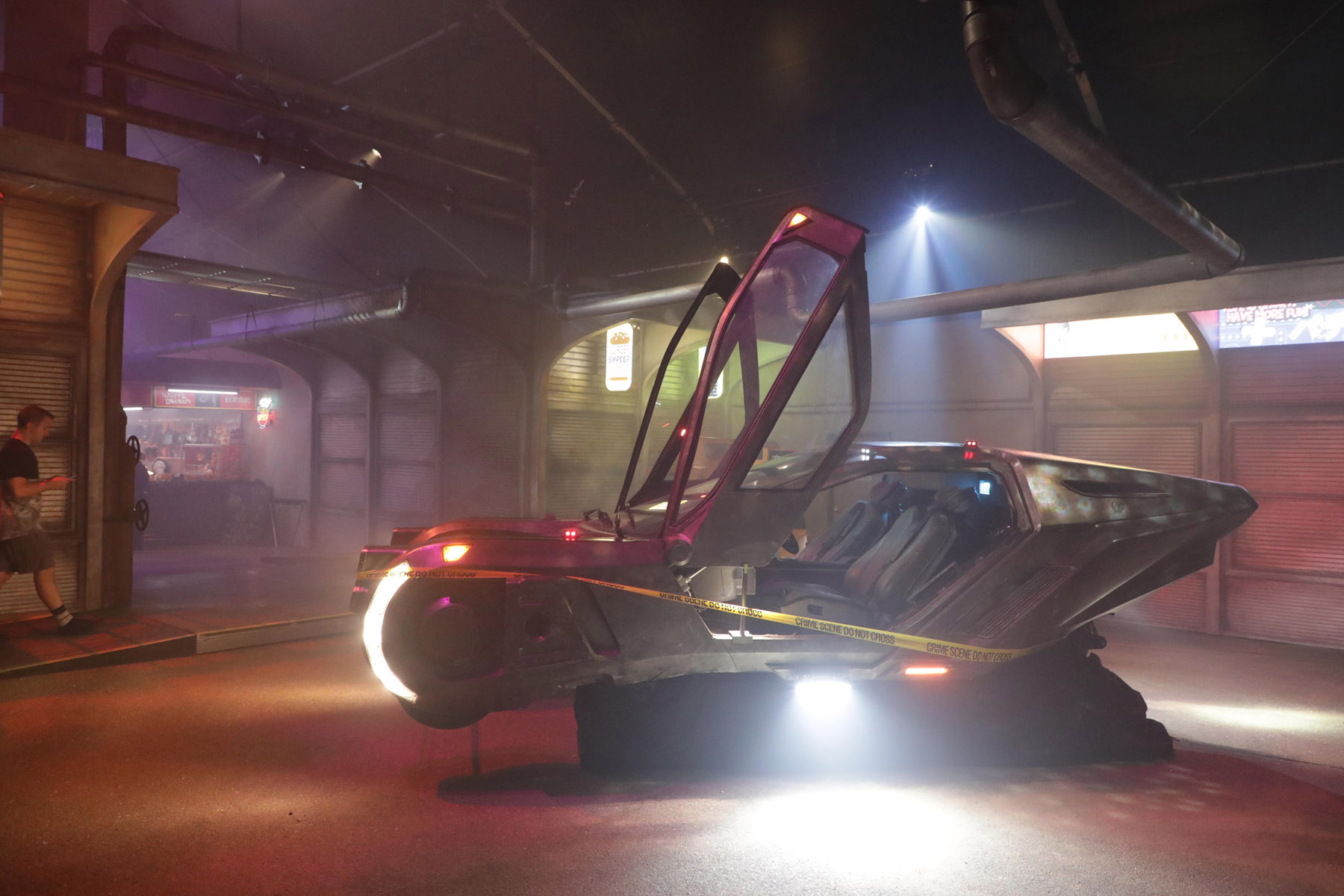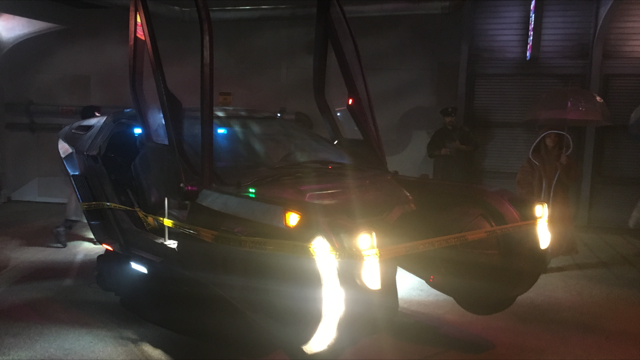 Once the chase is over, in the next (smoky) room there's a massive spinner, folks dressed up as cops, and extras in dirty clubwear asking if you're a replicant as some rain falls from above. "Nothing to see here," the cop says, protecting the abandoned spinner. In the next room, there are some great props in a recreation of Bib's Bar: