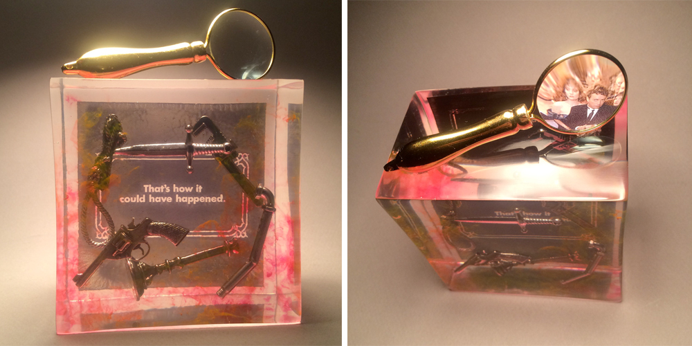 Personally, my favorite prints are the bookshelf with all the weapons on it that looks like a skull and the ornate paying card with everyone's face on it. But I will say that the 3D sculpture with the magnifying glass and weapons embedded in the bloody, transparent block is a great piece of work too.