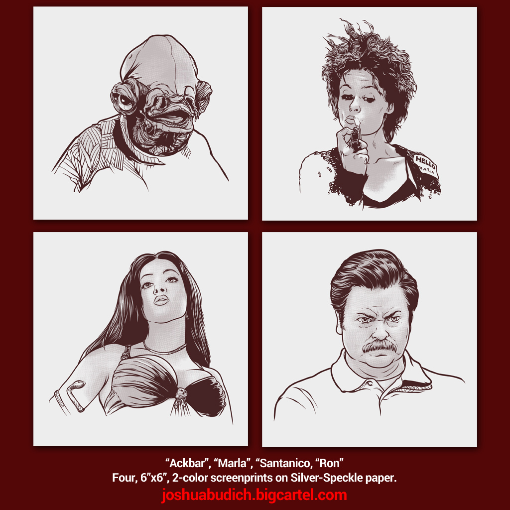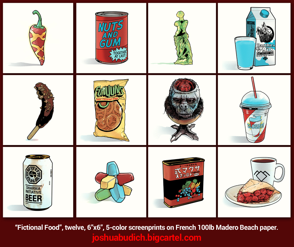 The below images are all now on sale at joshuabudich.bigcartel.com. There are around 25 of the Fictional food pieces, but 50 each of Ackbar,