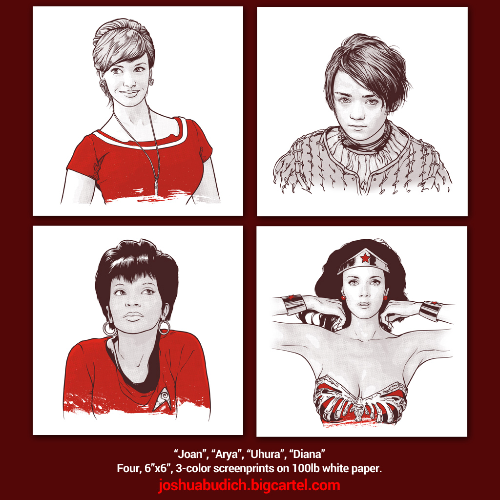 These aren't in sets, of course. Each image you see above is sold individually and is individually signed and numbered. These are all 6 x 6 inch screenprints, with varying amount of colors, and are only $10 each. Plus, if you over 6 or more, enter code "6x6Sale" to save 15% off your order.