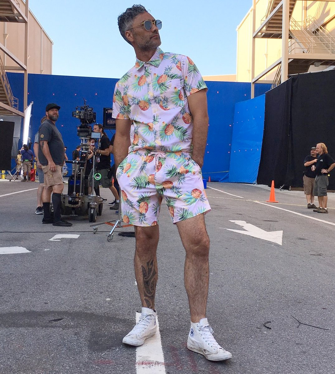 As you can see, the figure is the perfect likeness of Taika Waititi. In case you missed the director wearing this fantastic outfit, he tweeted about a similar one last summer while on the backlot of a studio last year, though the one donned by the figure appears to be a little more pink. He's easily one of the most best-dressed directors we've ever seen on any movie set, and he's just the essence of cool.