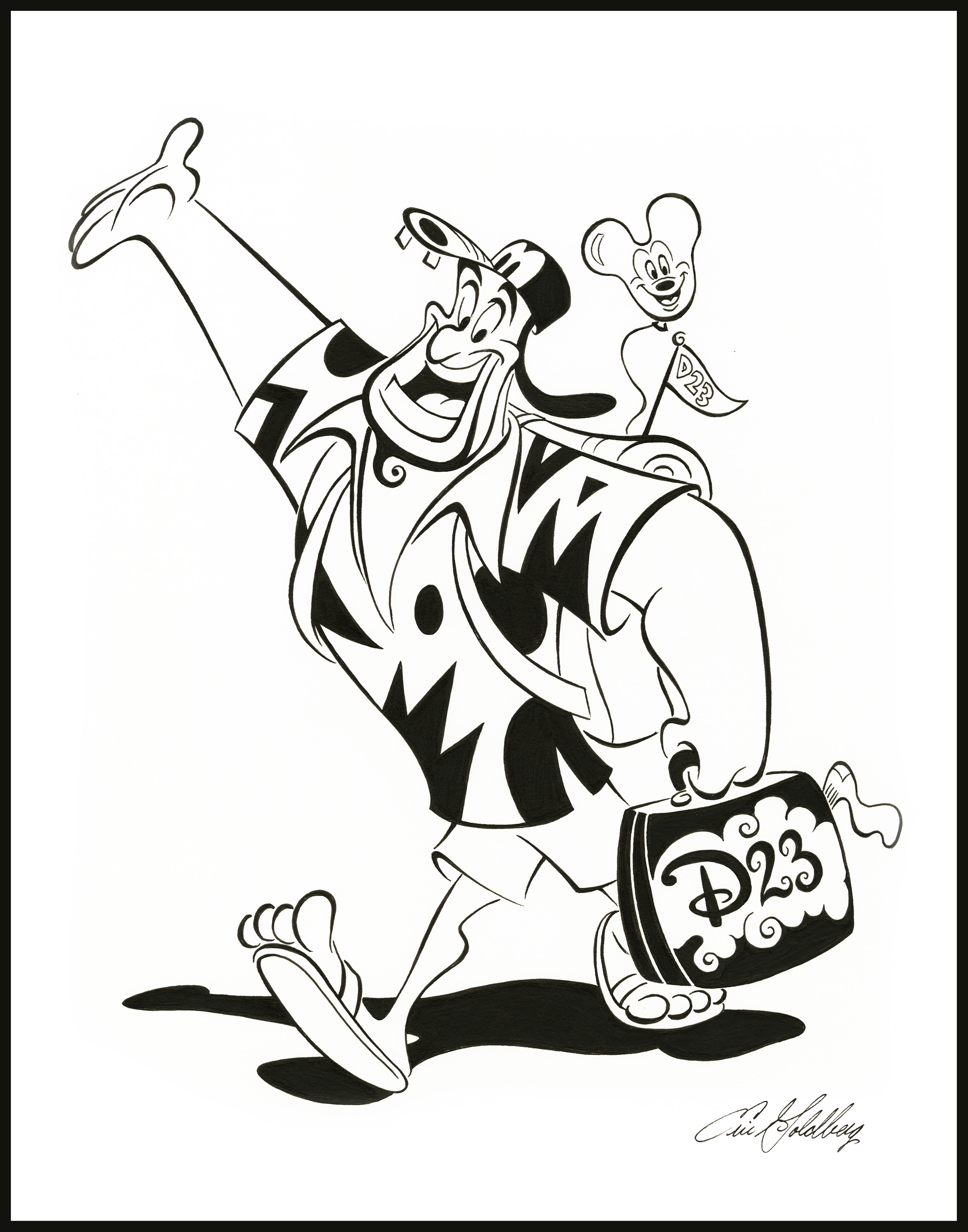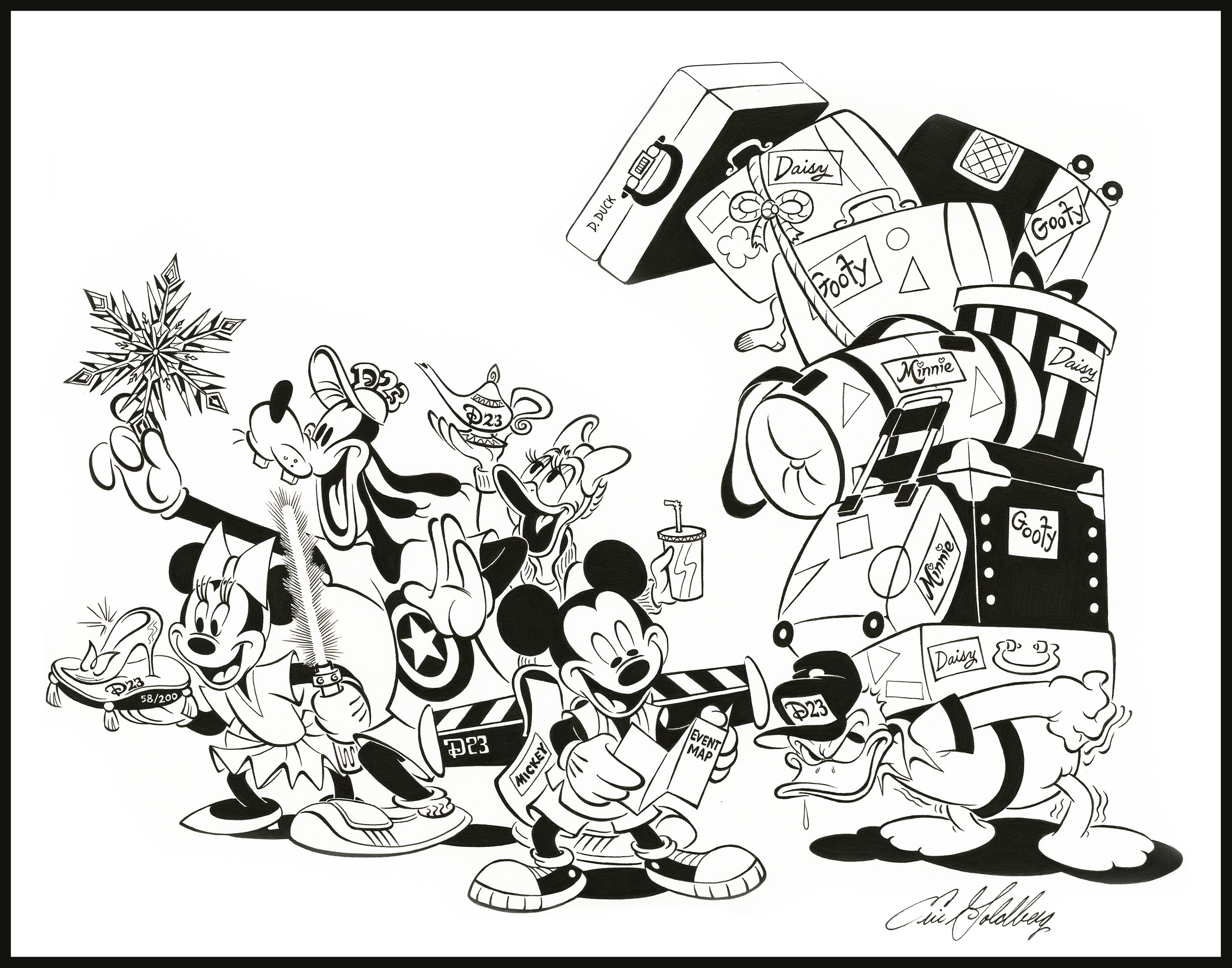 Eric Goldberg's "Genie's D23 Vacation" will debut at D23 Expo, but might also be sold in Disney retail locations after the convention. A serigraph limited edition hand signed print of only 123 will be on sale for $175. A mounted lithograph on board version of this print with a 500 print run will be available for the more affordably price of $40. And the Framed Hand Drawn Original Ink on Paper will be on sale for $4,400for one lucky rich Disney fan.Eric Goldberg's "The D23 Gang" is also available in different versions: as a Serigraph limited to only 123 prints, each hand signed by Eric Goldberg for $175. Another version will be Mounted Lithograph on Board with a Limited Edition of 500 for $40. And again, the Hand Drawn Original Ink on Paper will be available for $6,400 if someone can afford it.