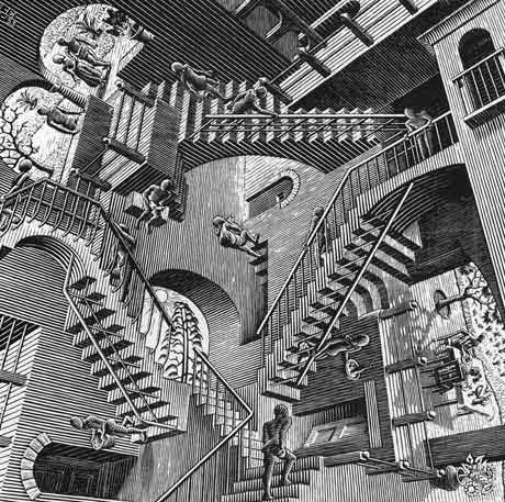 Davis' mention of Escher is of course a reference to Dutch artist M.C. Escher who is probably best known for his mathematically inspired art os the impossible. Here are some examples of his work: