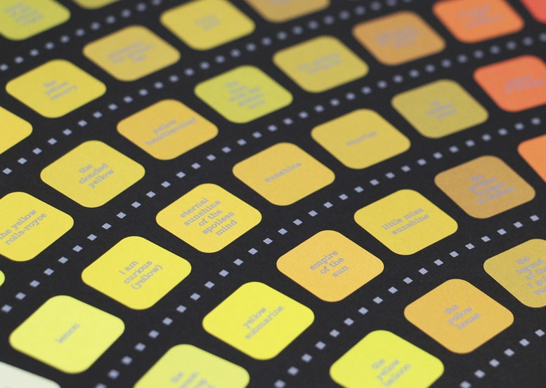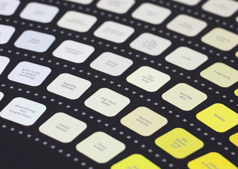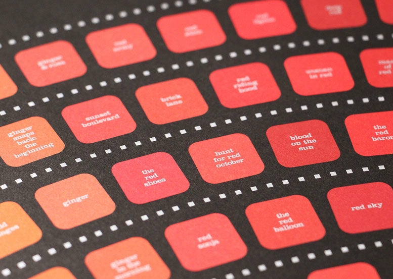 The Colour of Cinema is the newest addition to our Colour Wheel range and is a glorious 'technicolor' celebration of over 400 films which mention a colour in their title. The print, which takes stlystic inspiration from a film reel features Academy Award nominees including: How Green Was My Valley (John Ford), The Red Shoes (Powell & Pressburger), The Man With The Golden Arm (Otto Preminger), A Clockwork Orange (Stanley Kubrick), On Golden Pond (Mark Rydell), Moulin Rouge! (Baz Luhrmann), Little Miss Sunshine (Dayton & Faris), La Vie En Rose (Olivier Dahan), Black Swan (Darren Aronofsky), Silver Linings Playbook (David O. Russell) and Zero Dark Thirty (Kathryn Bigelow).