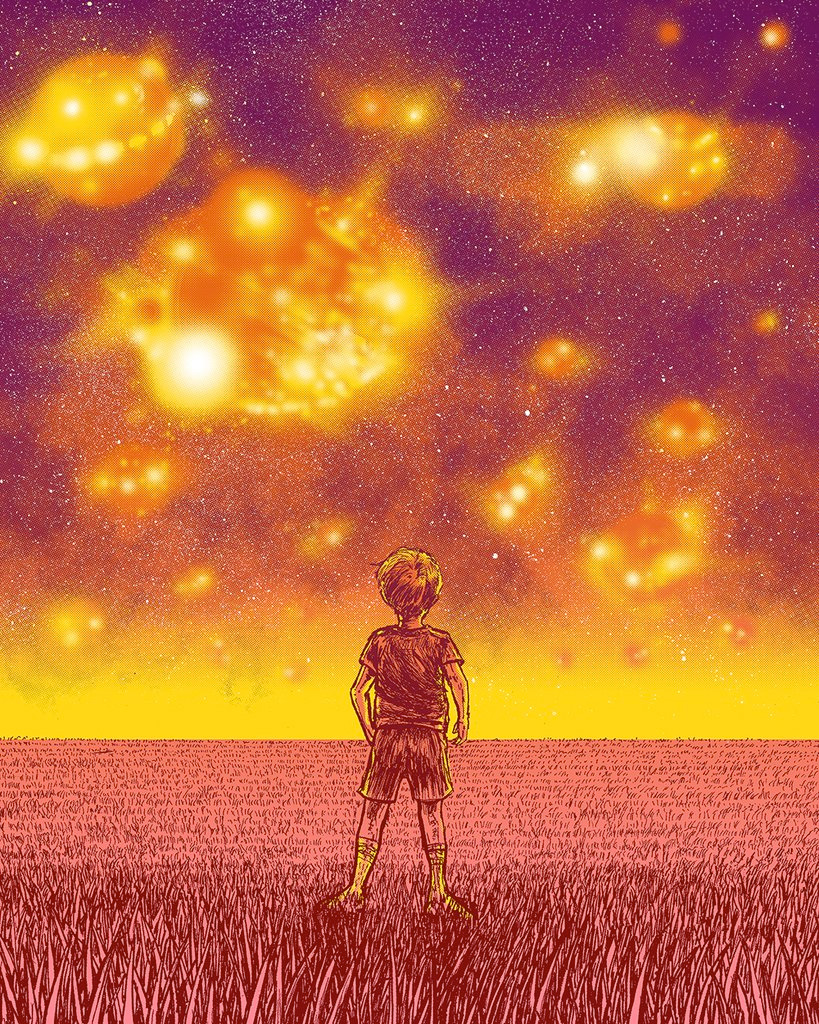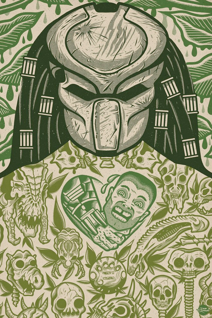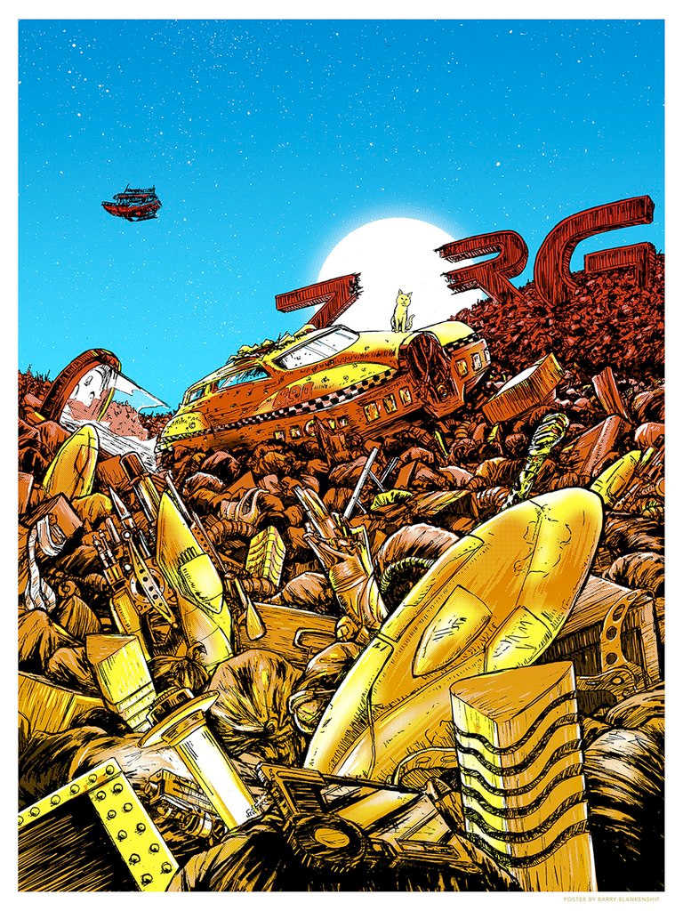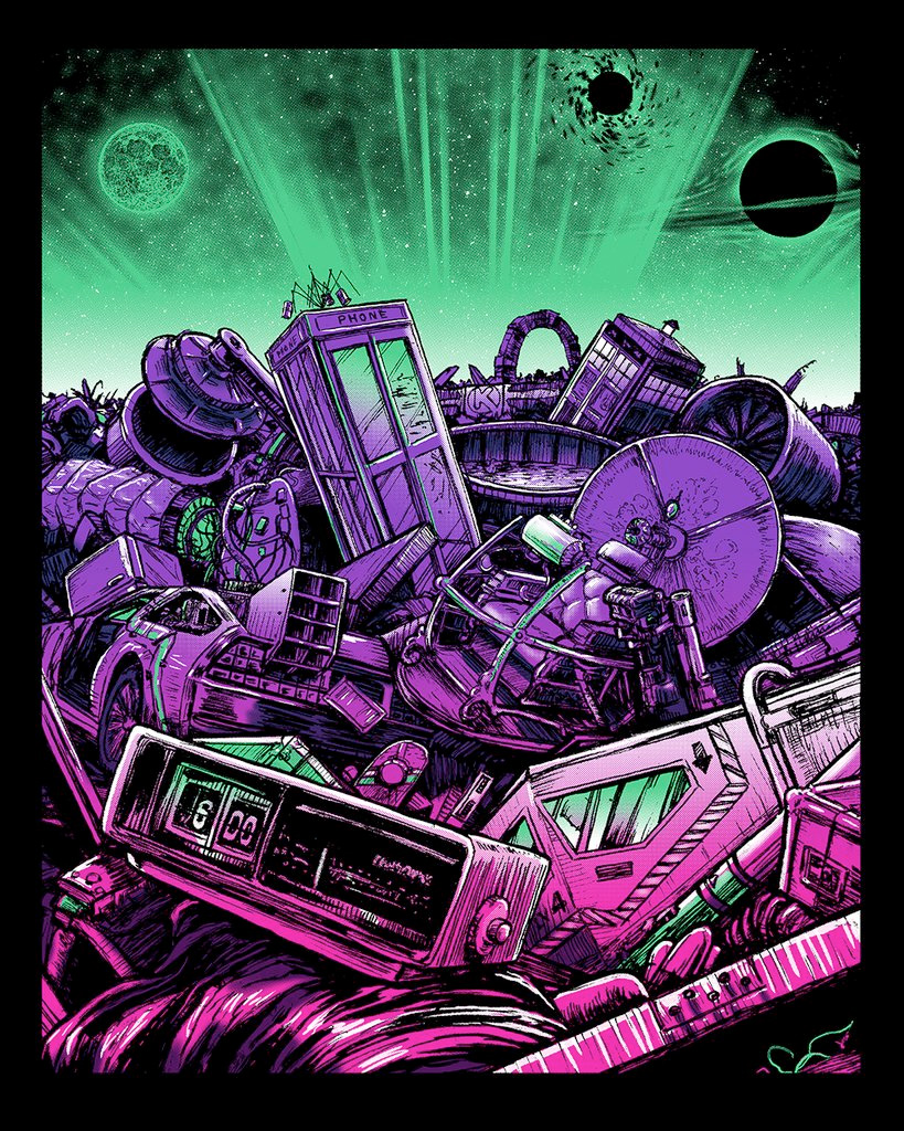 Barry Blankenship brings vibrant colors together, and he loves bringing together some iconic pieces from pop culture into a single image. In the case of his piece for The Fifth Element, he uses props and imagery from the movie as if they were in a junkyard. He does the same thing in another image, but expands his perspective to a variety of time travel movies by including things like the DeLorean time machine, the phone booth from Bill & Ted's Excellent Adventure and even the clock from Groundhog Day.