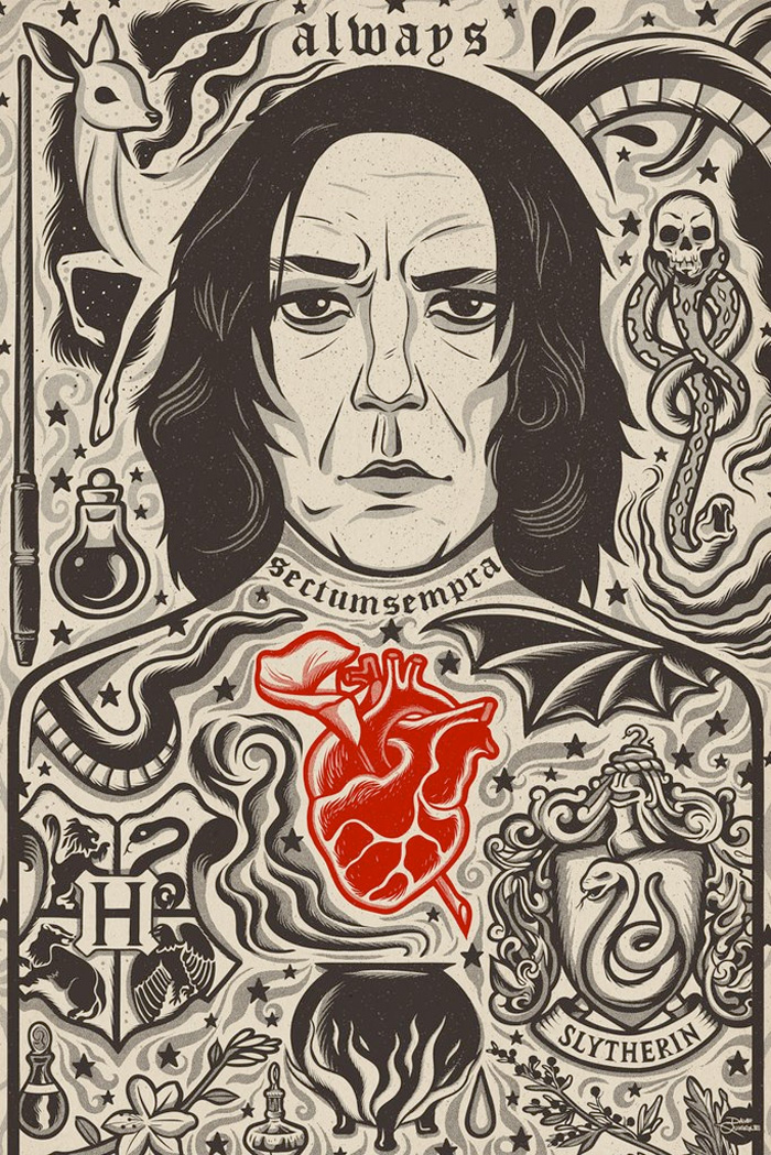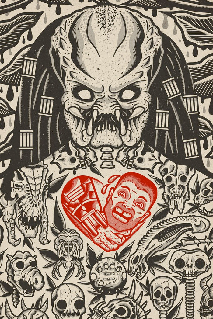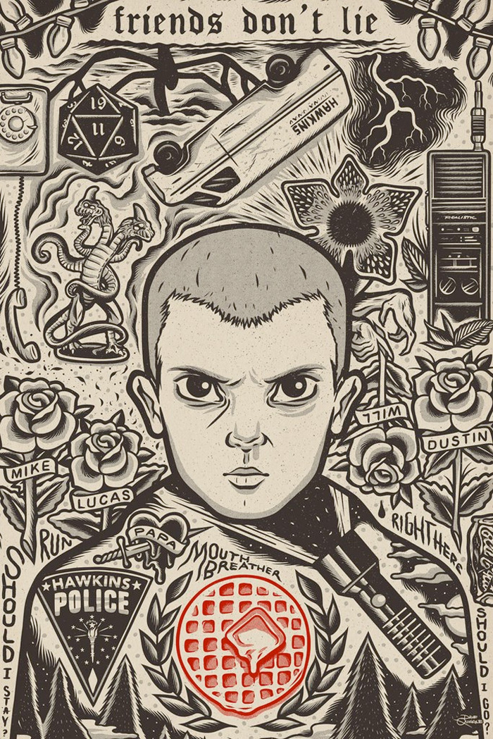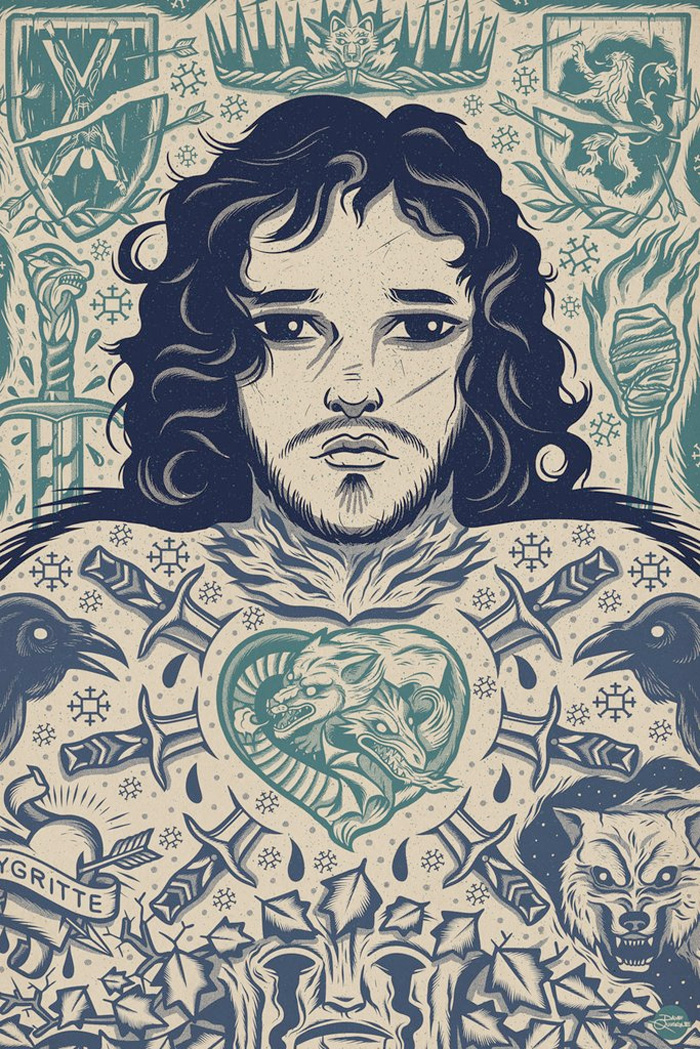 Meanwhile, Dave Quiggle uses far less color and much more symmetry to create his images. Looking almost like gothic playing cards, each of the illustrated portraits surrounds a particular character with items that define their character or the story they come from. As you'll notice, there's Eleven from Stranger Things, Severus Snape from the Harry Potter franchise, Dwight Schrute from The Office, the titular creature from Predator, Jon Snow from Game of Thrones and more.