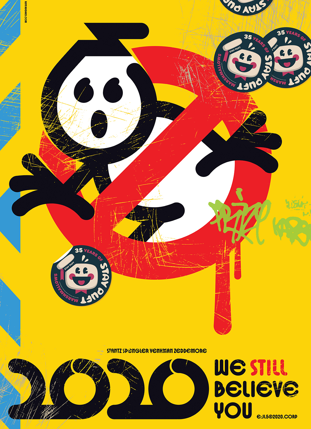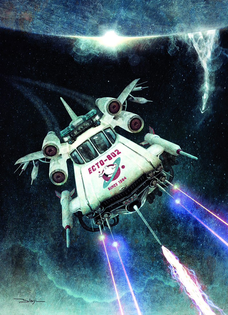 On the left, Rian Hughes has created a futuristic kind of Ghostbusters logo for 2020, almost as if the gang have still been in business after all these years. The names of all four of the original Ghostbusters are even listed, and there are even some Stay Puft marshmallow stickers slapped on their, as if the treat company has evolved with the times too. On the right, Alejandro Blasi delivered a piece that almost looks like concept art for Dan Aykroyd's original, grand idea for the Ghostbusters being an intergalactic organization that took on demonic and supernatural threats throughout time and space. Each is incredibly unique, and unlike anything we've seen in Ghostbusters before.