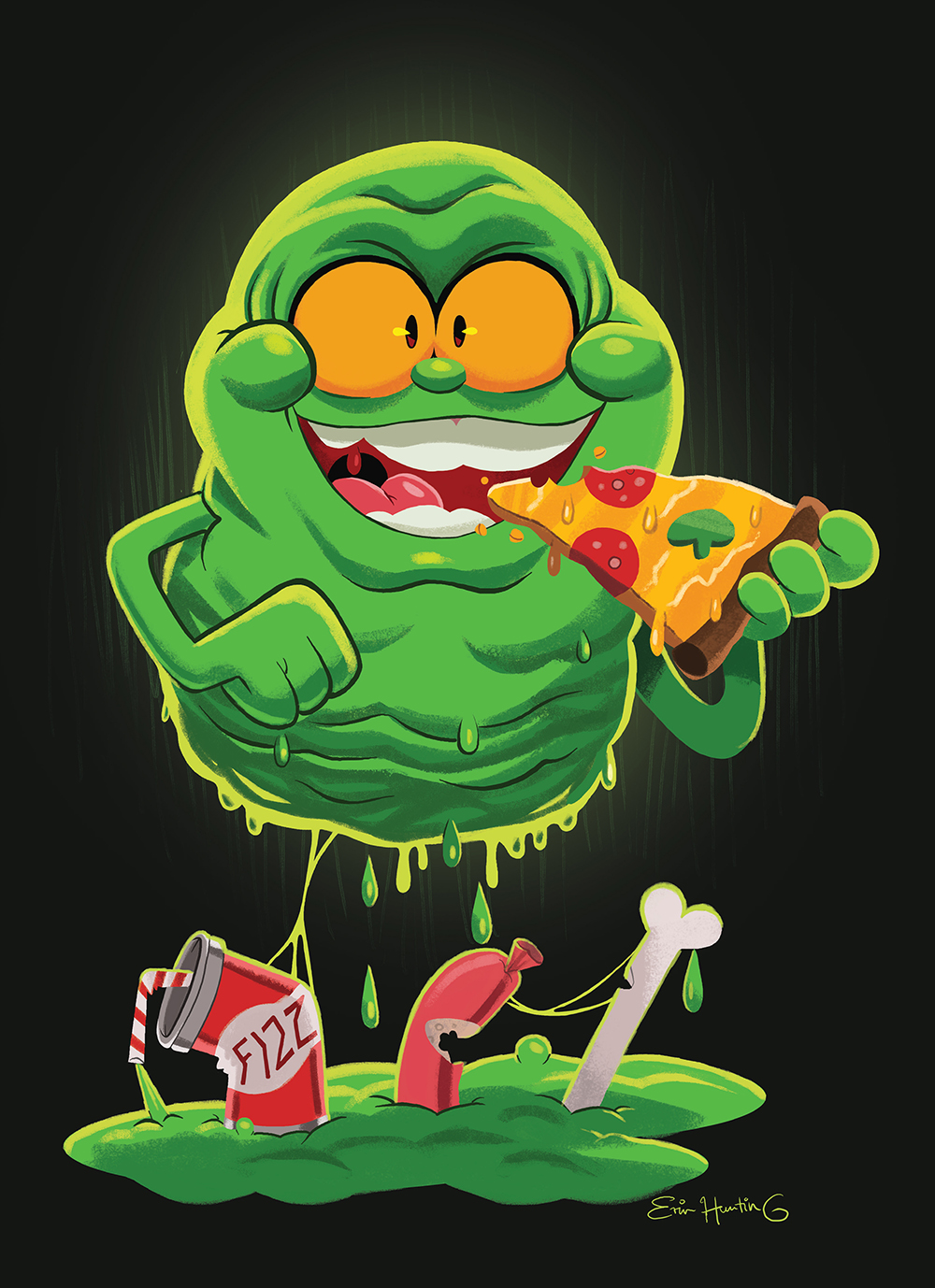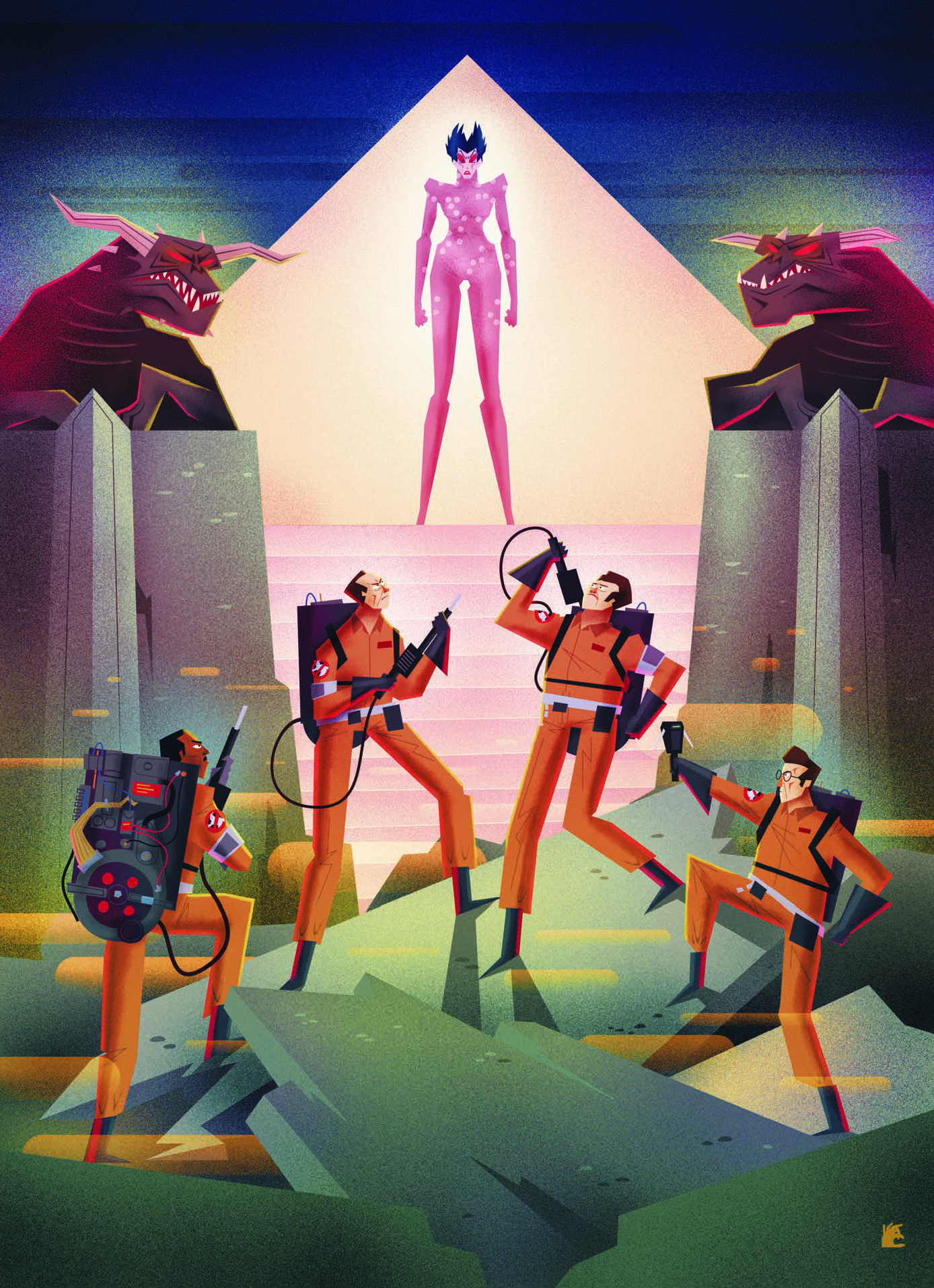 But don't worry, there are plenty of tributes to the classic elements of Ghostbusters too, just in extremely different artistic styles. Below you can see part of the spectrum with artists Mark Borgions (below right) and Erin Hunting (below left). One depicts the climactic battle between the Ghostbusters and Gozer the Gozerian in an art deco kind of style while the other takes a cartoonish approach to the ugly little spud known as Slimer, but not like the animated version we've seen in The Real Ghostbusters.