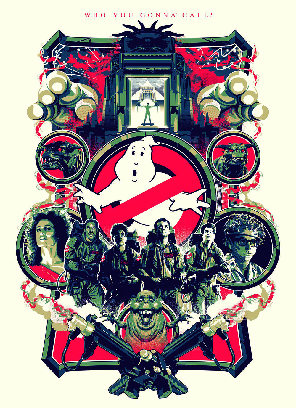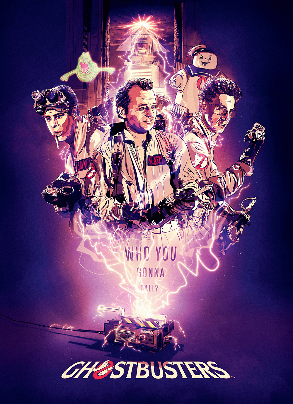 Within Ghostbusters: Artbook, you'll find a variety of alternate movie posters for the original Ghostbusters, paying tribute to iconic moments, scenes and characters. For example, above you can see how Dan Shearn (left) has created a poster that assembles all the Ghostbusters, the iconic logo, the proton streams, the Keymaster and Gatekeeper, Gozer's gateway, and the hands of the Stay Puft Marshmallow Man, all in a style that resembles a military-style emblem that would make one hell of a tattoo. Meanwhile, Fiona McCall (right) used a similar symmetrical aesthetic, but used the electricity and light of the ghost trap to contain all of the Ghostbusters elements. It's a little disappointing that Winston Zeddemore gets excluded here, as he frequently does, but the Ghostbusters were already formed before he came aboard, so we get it.