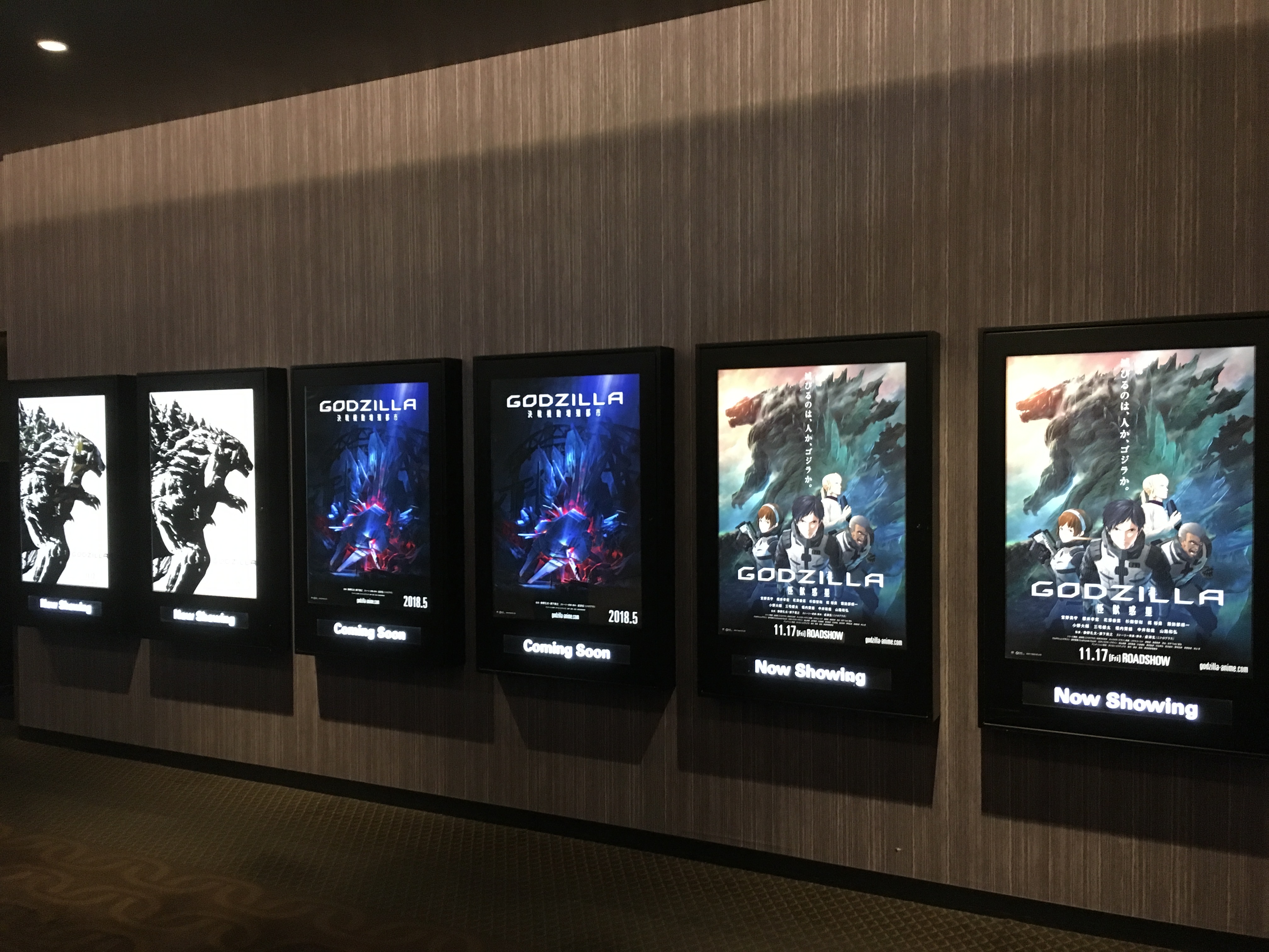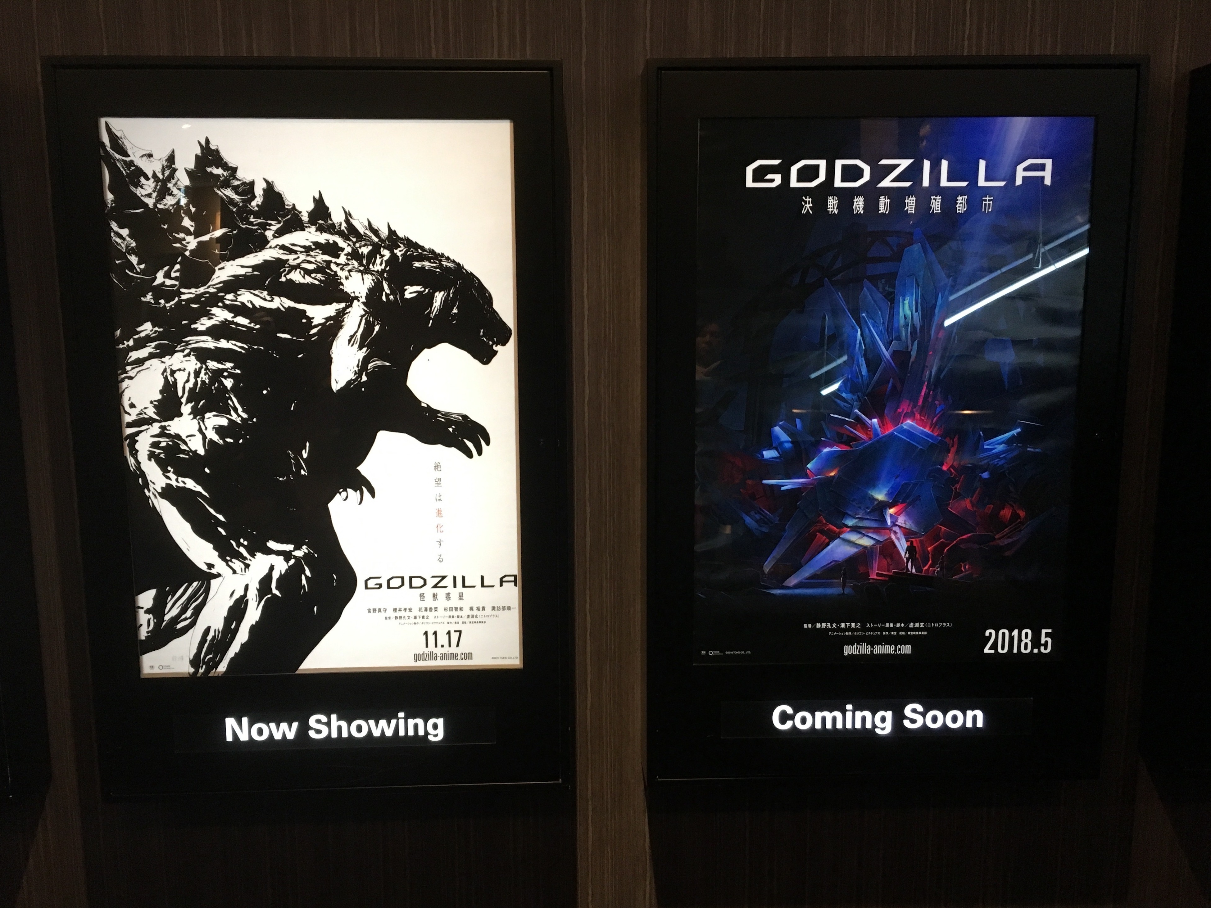 This might be an alarming comparison, but as a cinematic experience, it reminded me of what I heard about The Devil Inside, the found footage horror film that notoriously ended with a link to a website where the "ongoing investigation" would continue. In the same way, Planet of the Monsters ends very abruptly, then there is a post-credits scene teasing something random and new for the next movie. The last image that appeared on screen before the lights went up in the theater was literally an advertising still for the release of Godzilla Kessen Kido Zoshoku Toshi (Godzilla: Battle Mobile Breeding City) in May of 2018. Exiting into the theater lobby, a person might now notice the words "Coming Soon" juxtaposed with "Now Showing," as posters for this next movie stood out in a side-by-side display with Planet of the Monsters posters.