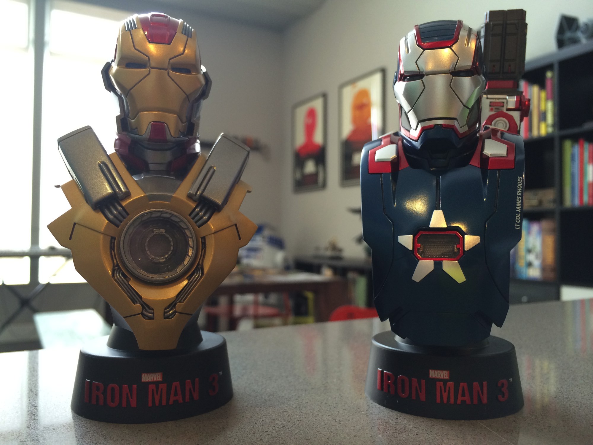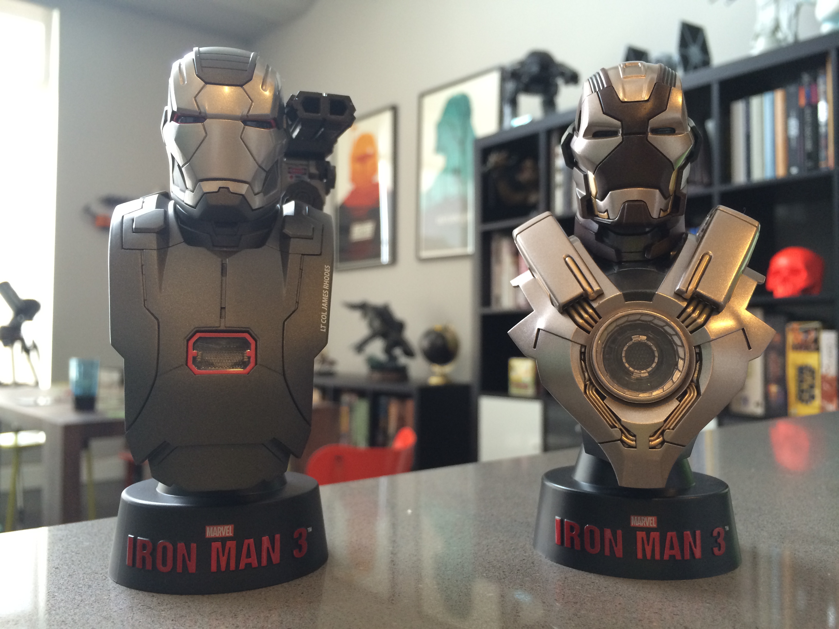 As with all of the Hot toys products, these Iron Man 3 mini busts are highly detailed and well painted. I especially like the cool paint detailing on the Mark 42 Battle Damaged Version. War Machine and Iron Patriot both come with guns which can mounted on their shoulders, faced up or forward.