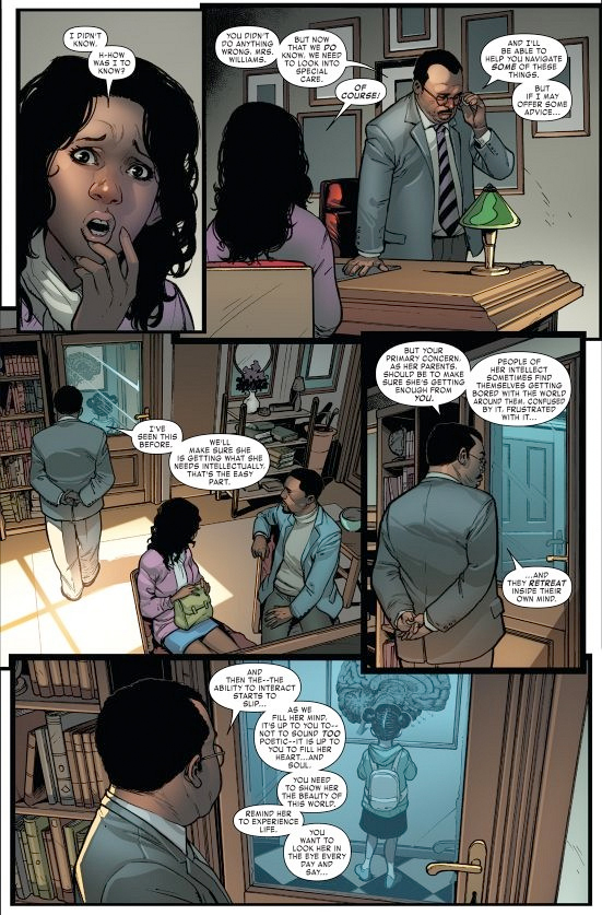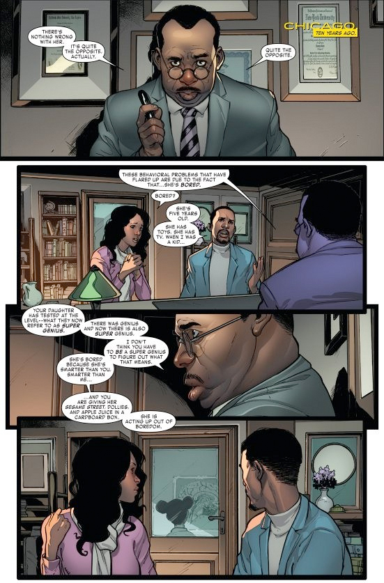 These panels provide a little background for Riri Williams, showing the moment her parents are informed that she's a super genius. While that's good news, it's clear her parents are also unsure of how to proceed to make sure she gets the attention she needs for the level of her intellect. And if you're wondering just how smart she is, writer Brian Michael Bendis reveals, "She's smarter than Tony."