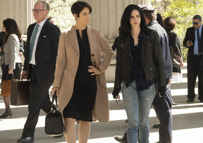 David Tennant plays Jessica Jones' main villain, Kilgrave a.k.a. the Purple Man. In the comics, he's full-on purple, like down to his skin and everything, but here his signature color is reduced an ombré scarf. He has ties to Jessica's past and "sends shockwaves" through her life when he resurfaces.Rachael Taylor plays Trish Walker, Jessica's best friend, also known as Hellcat in the comics, and Carrie-Anne Moss is Harper, another potential ally for Jessica. Mike Colter makes his debut as Luke Cage in a recurring role, before going on to headline his own show at Netflix next year. Rosario Dawson returns from Daredevil as Claire Temple. Eka Darville, Erin Moriarty, and Wil Traval round out the cast.