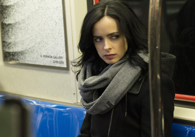 Krysten Ritter leads Netflix's latest Marvel series as the titular character, whose short-lived stint as a superheroine has come to a tragic end. She tries to rebuild her life as a P.I. who specializes in cases involving superpowered people. The Jessica Jones images also reveal David Tennant as Kilgrave, Mike Colter as Luke Cage, Rachael Taylor as Trish Walker, and Carrie-Anne Moss as Harper. See them all after the jump. Netflix unveiled the new Jessica Jones images. The running themes here are suspicious scowls and covetable fall outerwear.