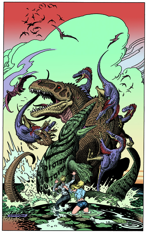 Towards the end of all of this merchandising I got a call from artist Will Meugniot, asking if I'd be interested in designing a Jurassic Park animated series. This was not going to be a kiddy show (although kids of all ages, including myself, could enjoy it). They wanted the show to be a mature prime time series with top writers and state-of-the-art television animation augmented with quite a bit of CG animation. Universal Cartoon Studios wanted a "graphic novel look" to the series. I came in, showed my portfolio and was hired.