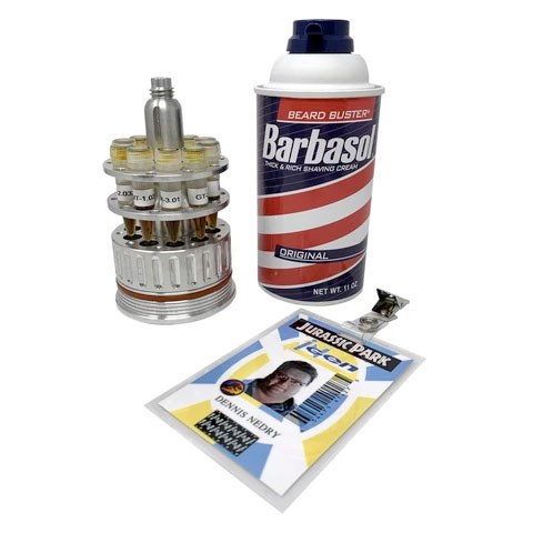 When engaging in corporate espionage, you need to have a fool proof plan. Especially when the company you are trying to steal from is genetics leader InGen. Fortunately, Dodgson, from rival company BioSyn, has planned accordingly. The result — a self-contained transport mechanism for 10 fertilized embryos, fully cooled* and compartmentalized inside, and encased within the innocuous facade of a common can of Barbasol™ shaving cream.