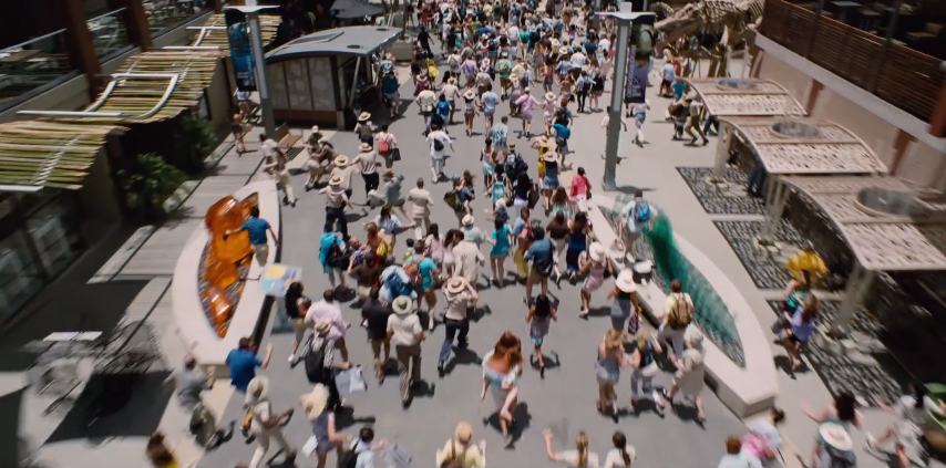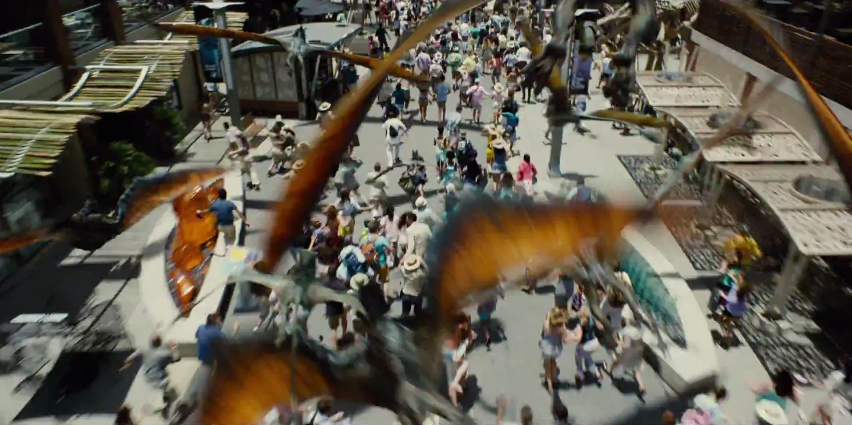 Remember this shot from the first trailer? Now we know what the people were running from. The pterodactyl attack is one of the big moments in the new trailer, but surprise! It was in the first trailer, in very unfinished form.