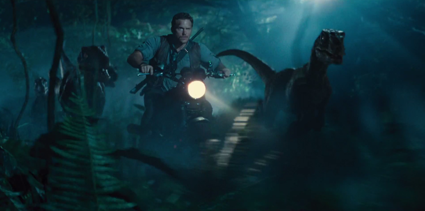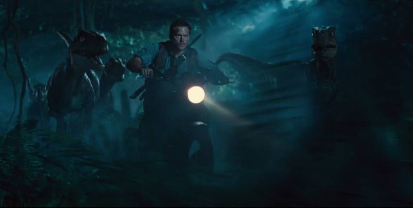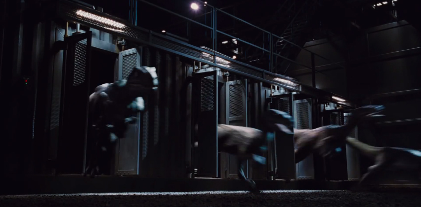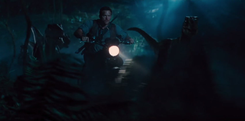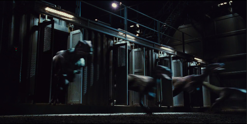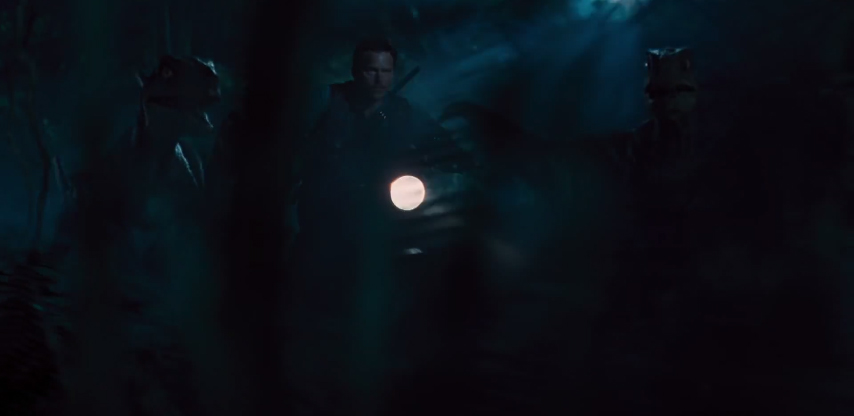 But the lighting changes in previous shots are nothing compared to this. There's far more light in this shot now, revealing more of the velociraptors and also Chris Pratt's character.