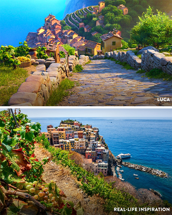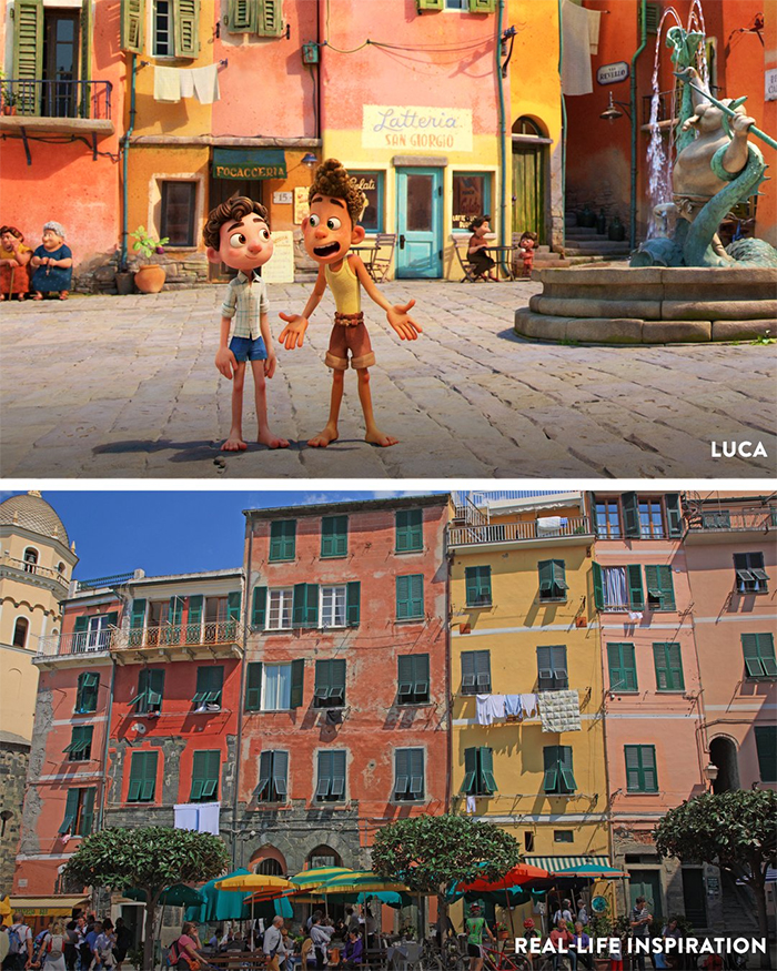 Pixar Animation shared these reference photos from the Italian Riviera showing off some of the locations that inspired the setting of Portorosso. As you can see, this beautiful cavern actually existed seaside. The real life photo isn't quite as detailed as Pixar's rendition, but that's due to Pixar's efforts to create imagery that is a mix of photorealistic and beautiful. Even so, if you were to remove the cartoonish characters of Luca and Alberto, you'd probably have a hard pinpointing this as an animated setting.