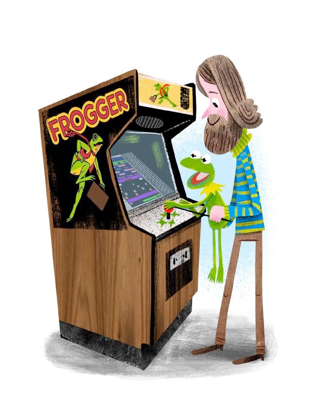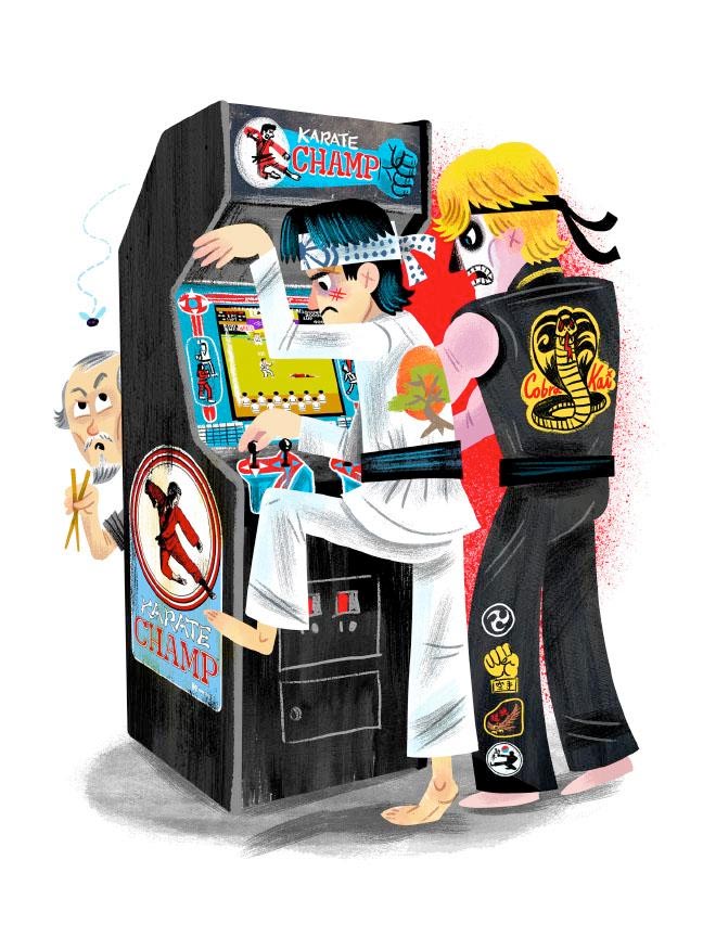 Here's a collection of characters playing some old school video games that make cute reference to their relationship on screen. Jim Henson puppets Kermit the Frog and plays Frogger with him. Daniel LaRusso and Johnny Lawrence from The Karate Kid play a fighting game. Beebop and Rocksteady play the Teenage Mutant Ninja Turtles arcade game. And Luke Skywalker, Yoda and the spirit of Obi-Wan Kenobi are playing TRON.