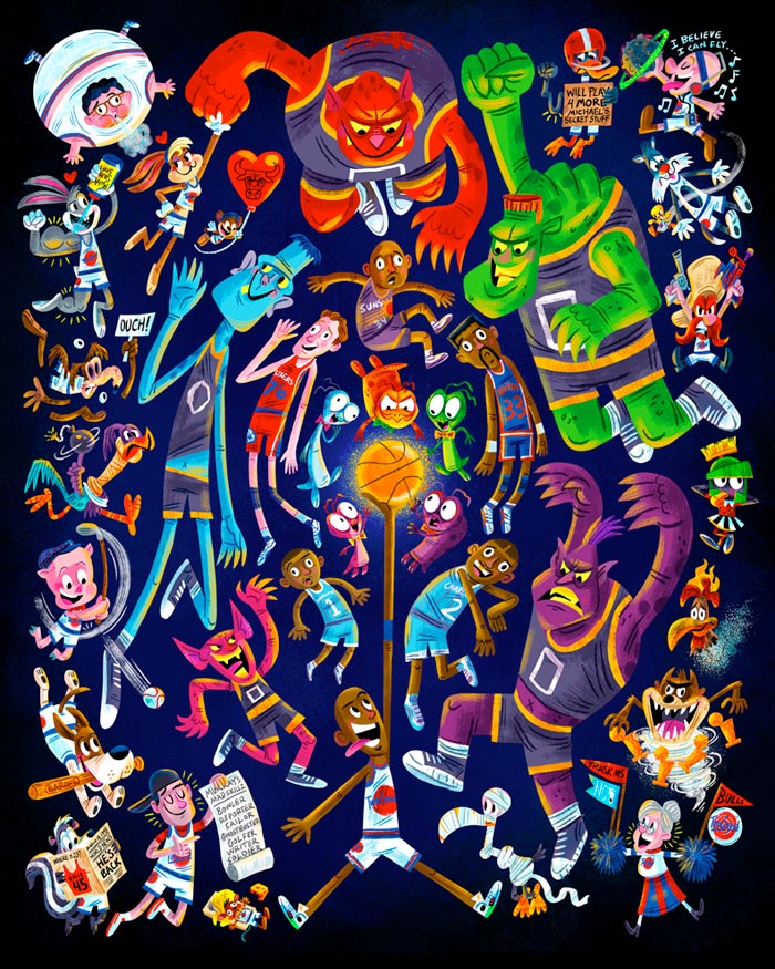 The Looney Tunes get some love with this collection of a variety of characters from the classic cartoon shorts. They also revolve around the glowing basketball of stolen court skills in a cool Space Jam print. Not only are the Looney Tunes on display, but so are the Monstars, Michael Jordan, the assorted NBA players who have their talent stole, and Bill Murray too.