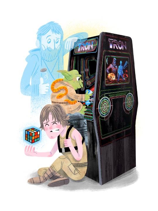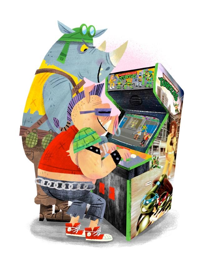 With a series of prints that feel lifted from children's books, you can watch characters from Star Wars, The Karate Kid, and Jim Henson play arcade games. Maybe you'd like an illustrated timeline of the first Back to the Future movie. Or perhaps you'd like to learn the alphabet from the Teenage Mutant Ninja Turtles or He-Man and the Masters of the Universe. Check out prints like that and much more from the Luke Flowers Raised by Rainbows art show below.