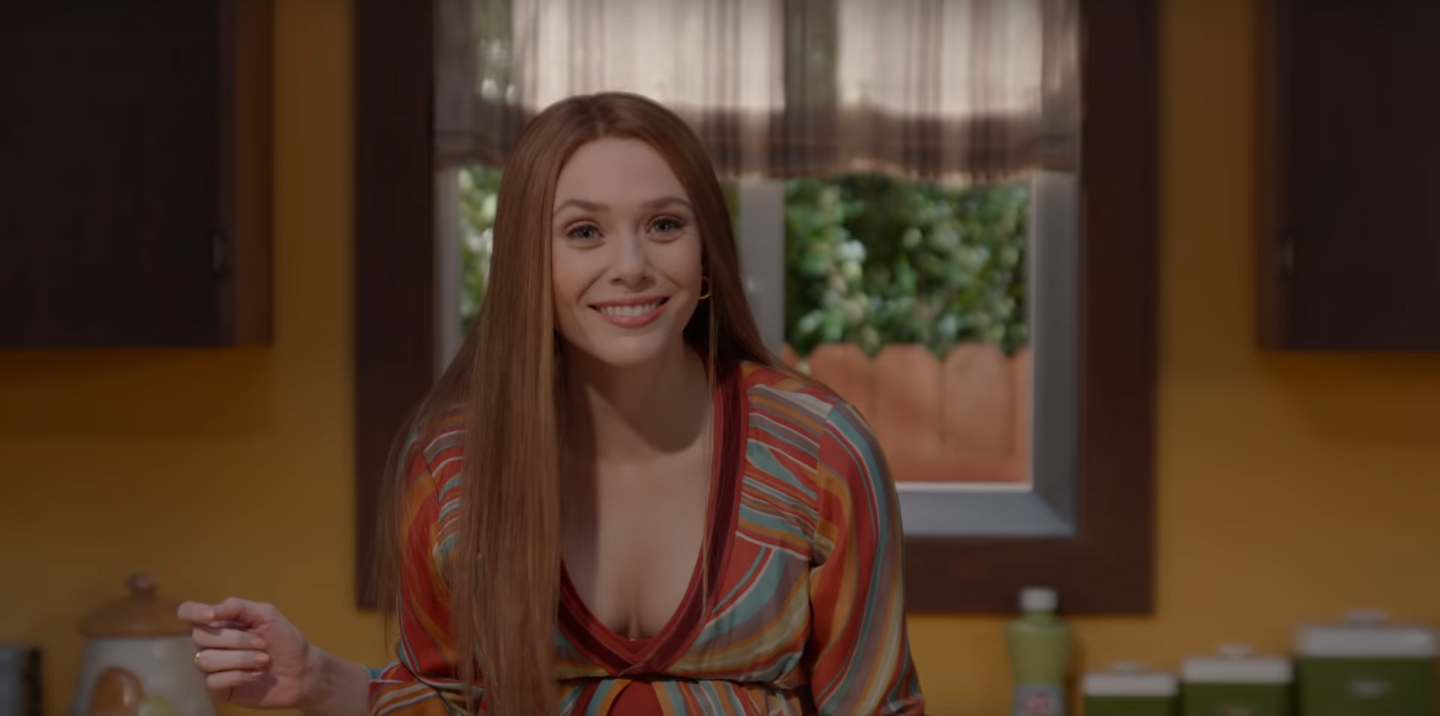 The next shot shows Wanda in a similar fashion from the same period, but it also quickly flashes to other decades. Vision says, "Wanda, welcome home." And then we suddenly get four quick flashes of different versions of Wanda.