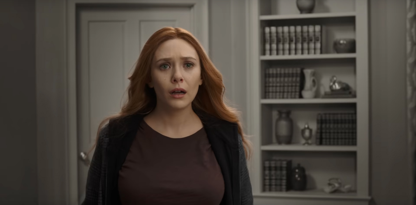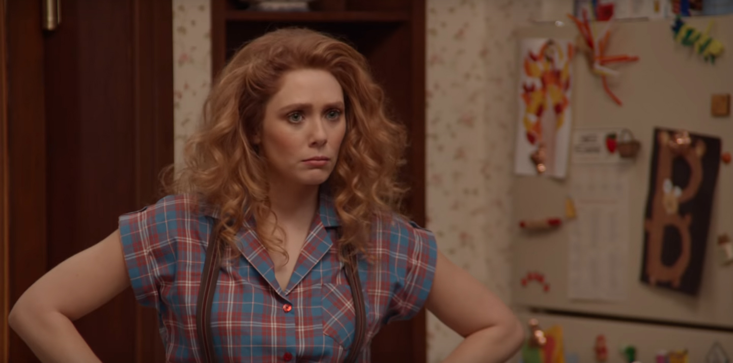 A shot of Wanda answering the phone ("Vision residence!") is shown on a vintage television, and we suddenly pan up to see a freaked out Wanda, in color, in the middle of the black and white setting.