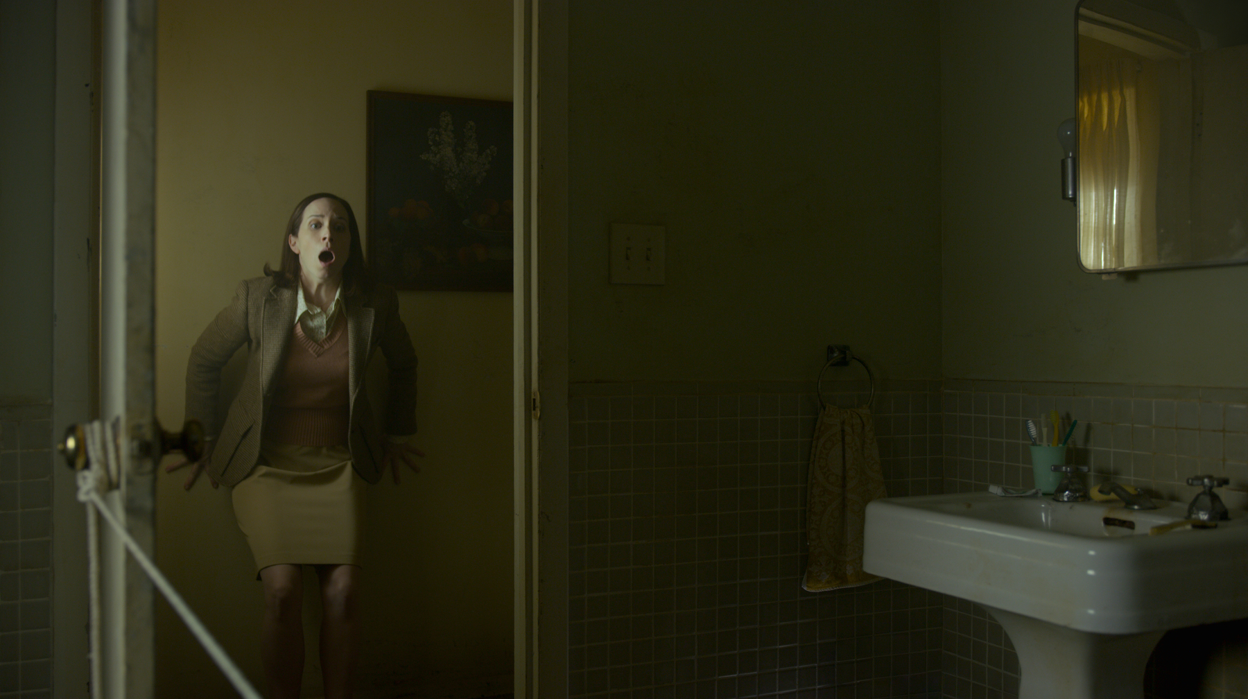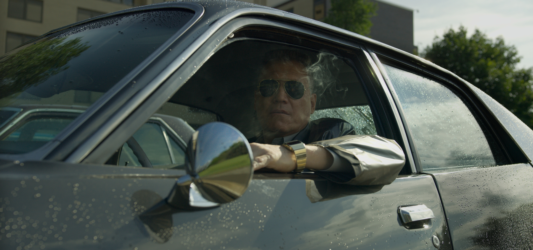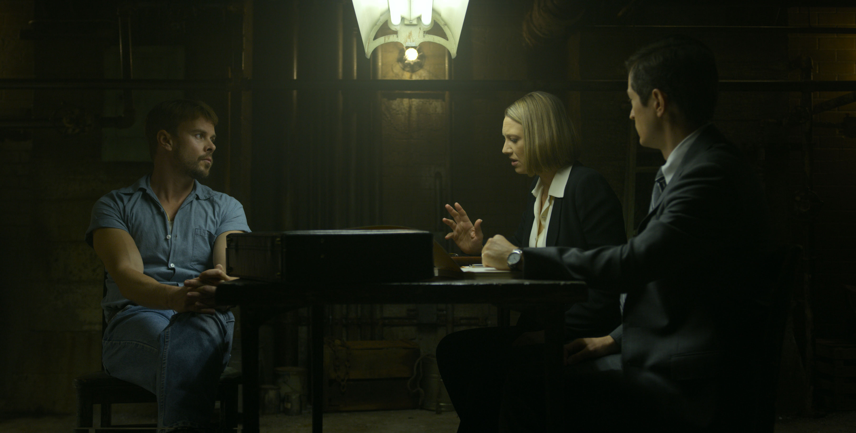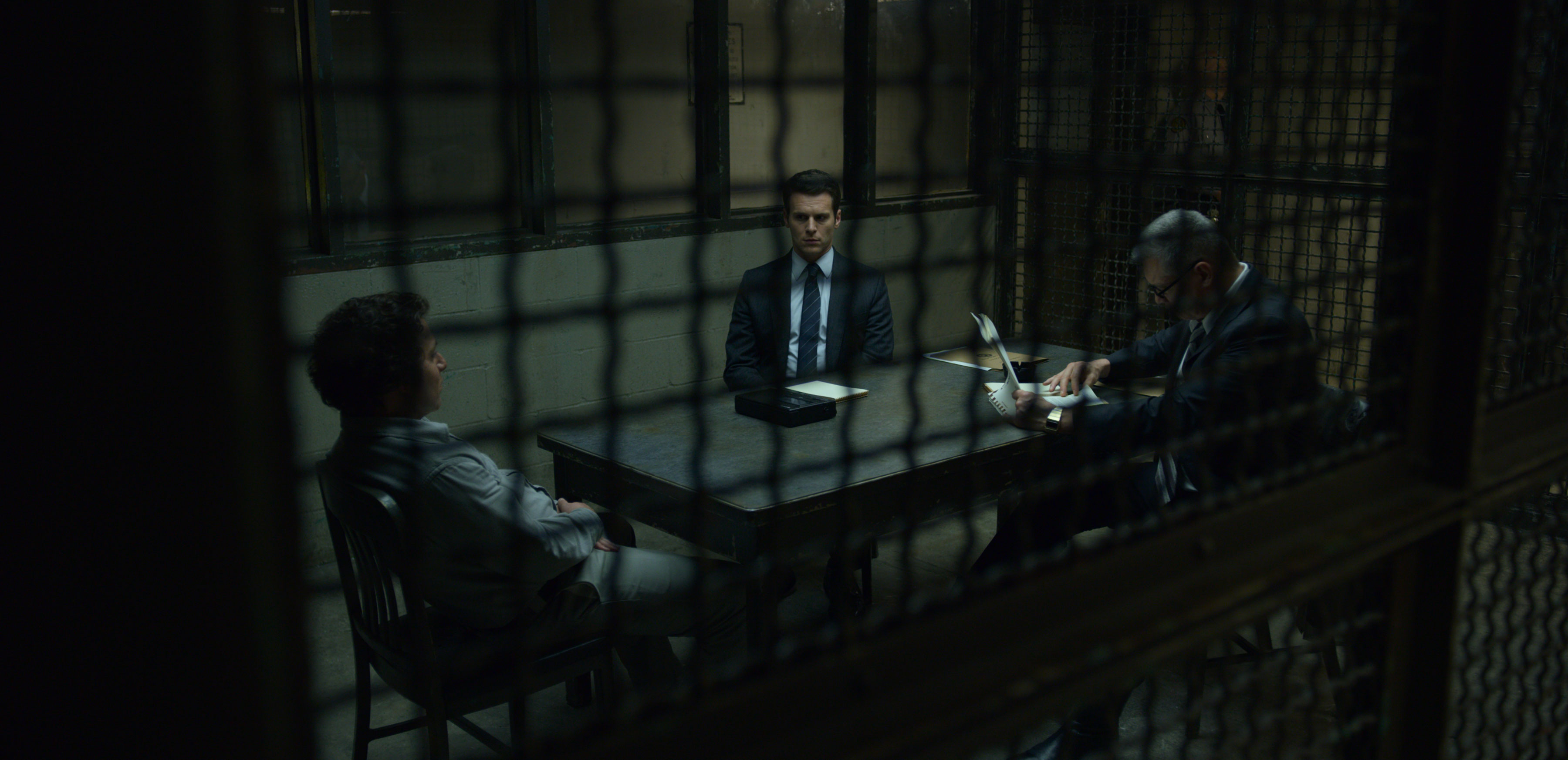 Of the bundle of pics, this might be my favorite. It shows FBI agents Holden Ford (Jonathan Groff) and Bill Tench (Holt McCallany) gazing down at what looks to be the outline of a child who may or may not have been crucified. I have no idea what's going on here, but it's alarming, and disturbing. The lighting in this pic – lots of clouded darkness cut through by faint light from the garage windows – is perfect.