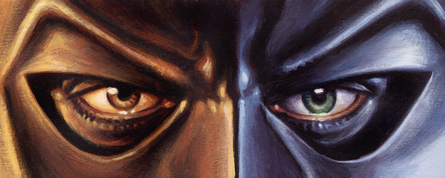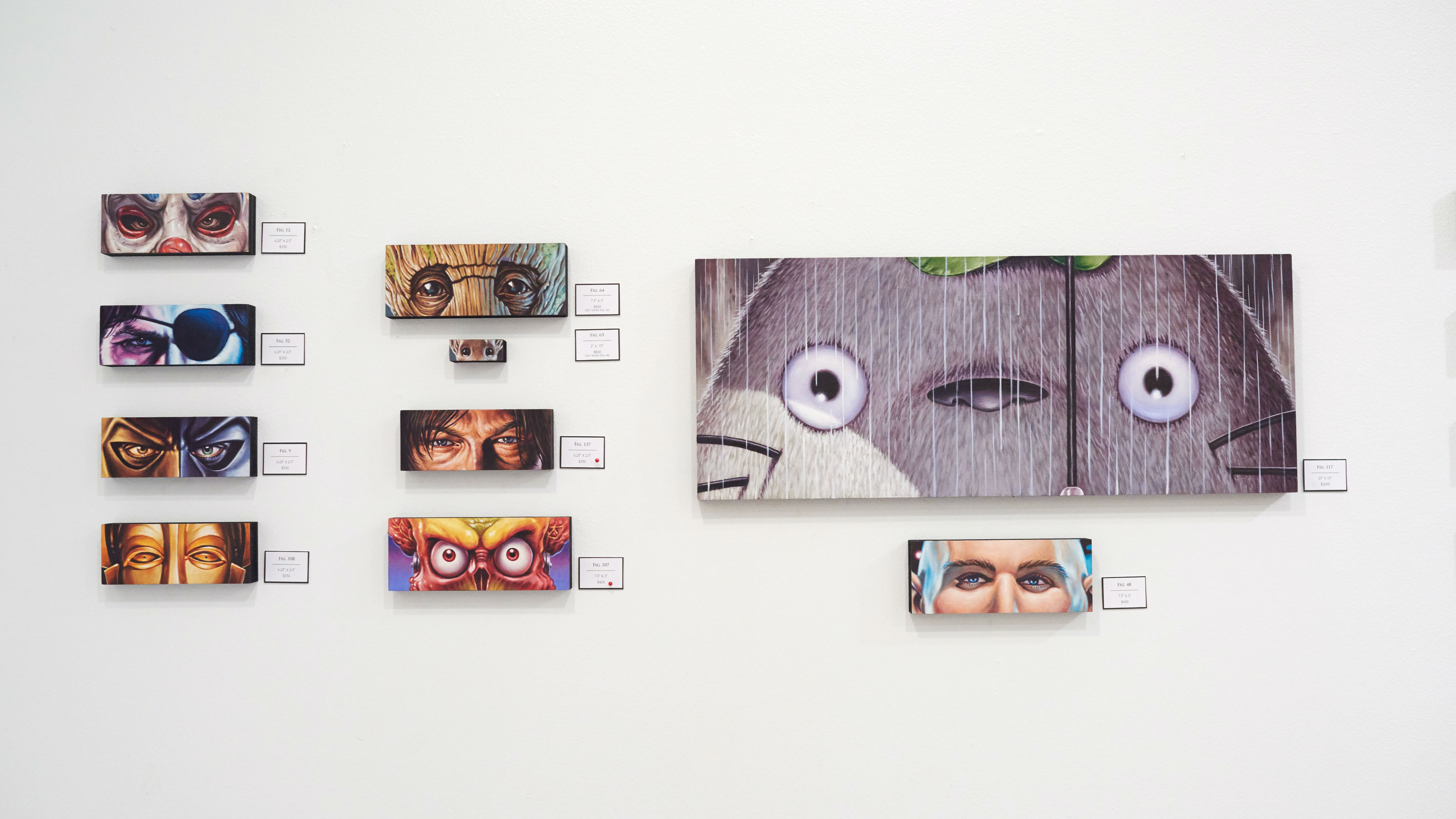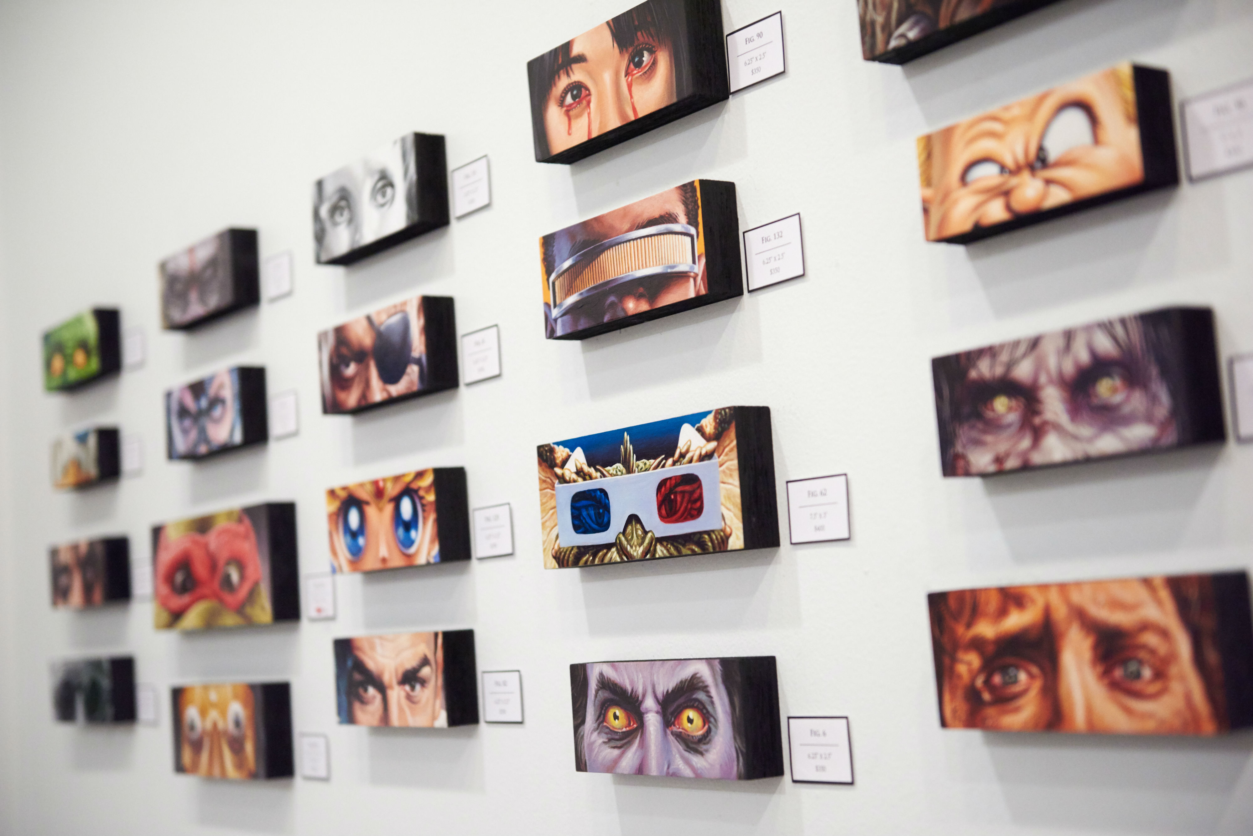 The essence of every character is the eyes and nowhere is that better seen than right this moment at the Mondo Gallery in Austin, Texas. Their latest exhibit is called Eyes Without A Face by Jason Edmiston. Edmiston is an unfathomably talented painter who can capture the likeness and emotion of a character in ways you didn't think were possible. He takes that ability to the next level with this show, where he painted the eyes of over 150 different pop culture characters. It's a unique and fascinating exercise to prove you can almost instantly pick out any character, just by seeing a few inches of their face.