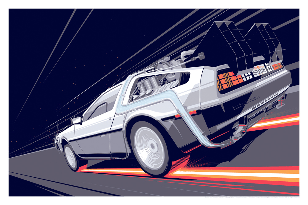 Both pieces measure 24" x 36", with the regular having an edition of 325 and costing $45, and the variant having an edition of 175 and costing $65. Here's what the artist had to say about Back to the Future: