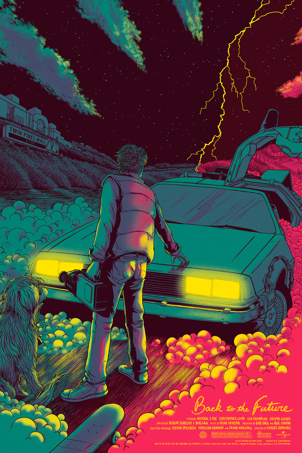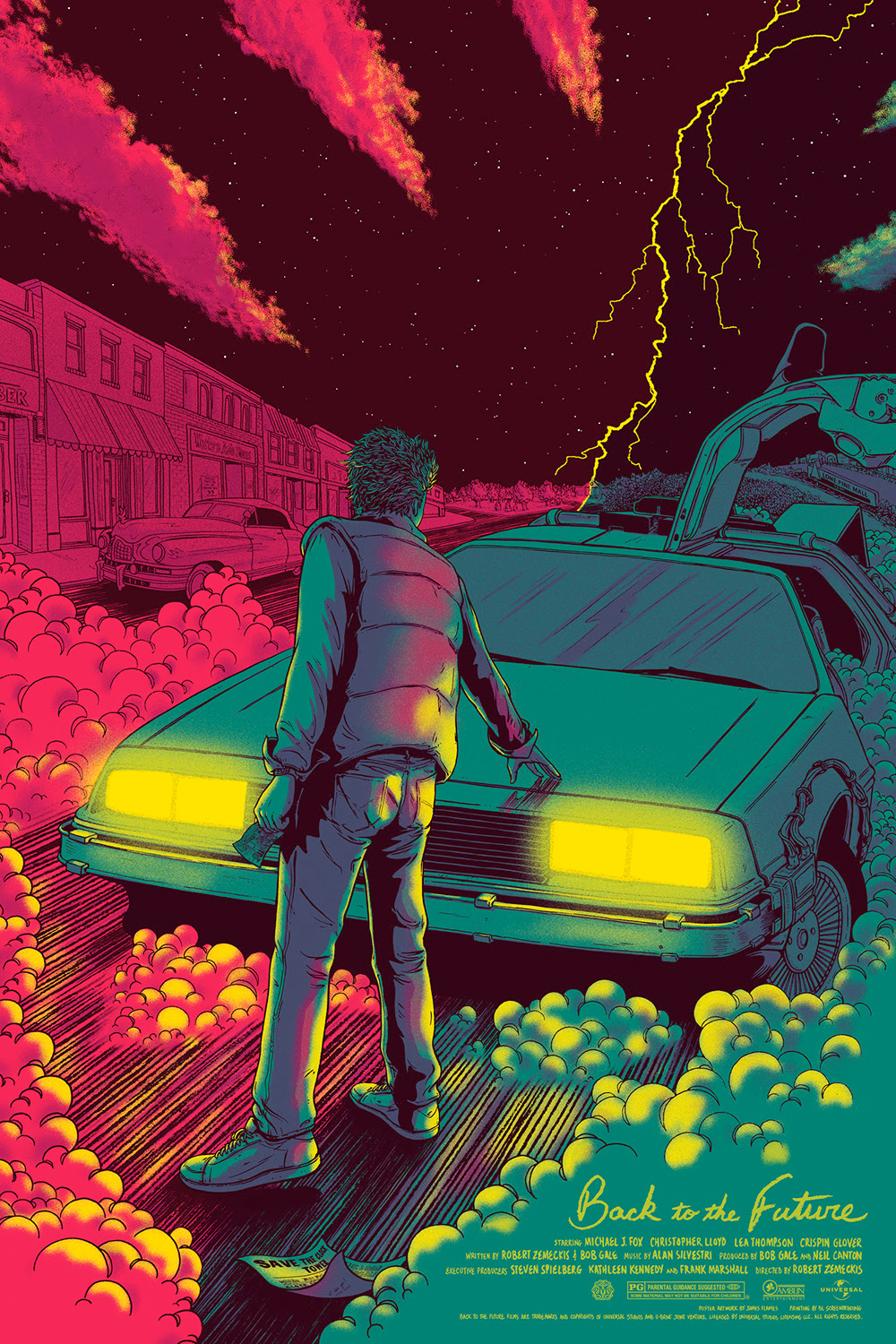 If I'm being honest, there are very few movies that I liked as a kid that actually still hold up for me today. Very, very few. But man, the original BACK TO THE FUTURE is definitely one of them. I mean, I know why I liked it back in the mid-80s – like most kids, I was crazy about cars, crazy about 50s music, and Michael J. Fox was like the coolest dude out there. Everybody I knew wanted to grow up to be like him. Dude wailed on guitar! But what I can better appreciate about it now is that it wasn't just cheap kid's fluff – there's real storytelling in there, great characters, cool concepts. And at the heart is this kid and this car, and the amazing adventure they get into together. And that's what I wanted to focus on with my poster. That moment where Marty meets the Delorean...his life, and the entire world, are changed forever in that very instant. And of course, it was fun to play with the two time-eras and split them apart in the background (and then reverse them for the variant edition). So stoked to have gotten to illustrate such a cool movie. Heavy.