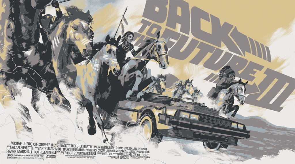 As soon as Mondo asked me to do a poster for PART 2, I pretty much immediately knew what I wanted to do for PART 3. I know it has its naysayers, but as it was the only one of the movies I saw in the theatre upon release, it has a special place for me and was the one I really wanted to do a poster for. BTTF has always been this brilliantly weird anachronistic mess of styles with an 80s take on the 50s – and then that filtering back to the 1880s – so I wanted to make something that had hits of all those periods; the 1980s palette, the modern layout and the 50s lifestyle-esque styling of the horses. I don't know if I was completely successful, but it's the poster I'm most happy with, and I'm sure will present some interesting framing questions for those who want to hang all three of my prints for the trilogy – sorry!
