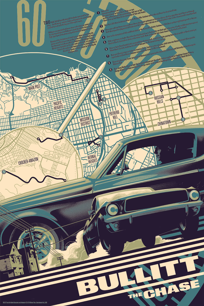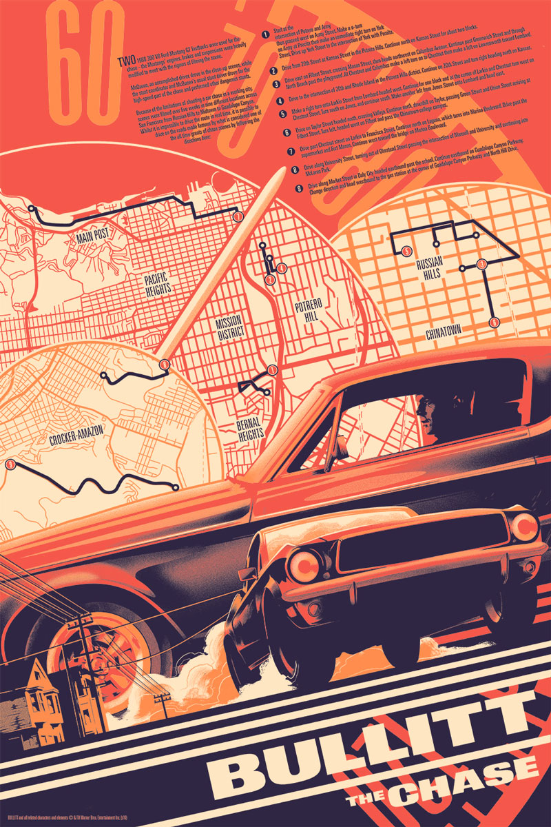 The gallery show is comprised of twenty new posters, each of them touching on some of the most popular titles in modern pop culture history. Subjects include Back to the Future, Jaws, Batman, the Teenage Mutant Ninja Turtles, Star Wars, the Avengers, Jurassic Park, and Spider-Man. However, my favorite of the bunch is undeniably Matt Taylor's Bullitt poster, which captures the cool energy of the Steve McQueen classic while also breaking down the basics of the films iconic car chase.