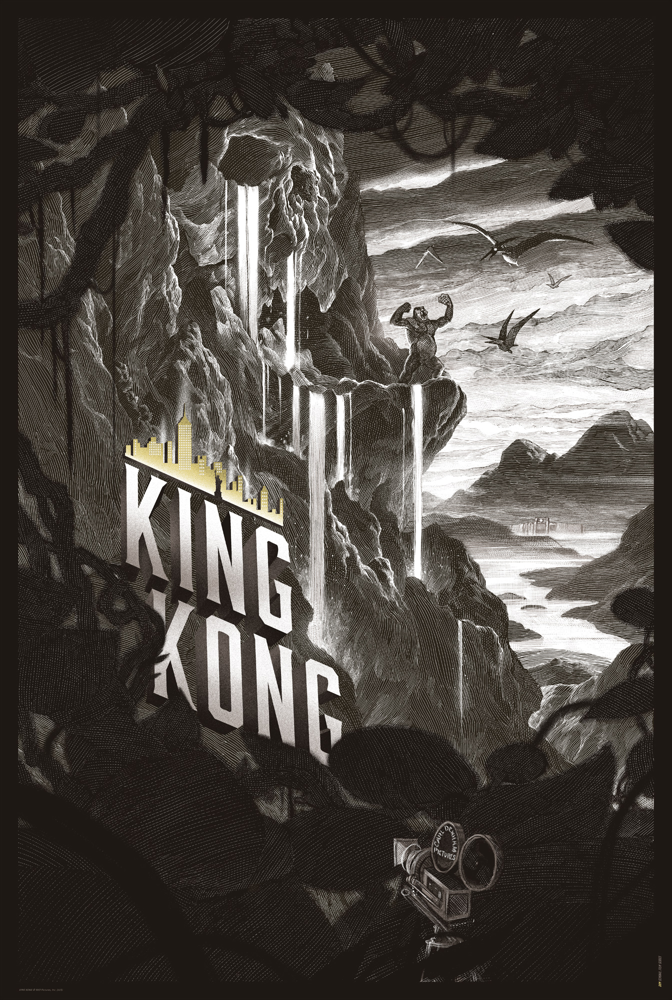 Dark Hall Mansion is proud to reveal its latest entry in the DHM Seminal Film Series of limited edition print releases, 1933's classic, "King Kong," by artist Nicolas Delort and on sale Friday, May 15th!Dark Hall Mansion, under license from Warner Bros. Entertainment Consumer Products, has invited leading artist, Nicolas Delort, to take on one of the most influential and groundbreaking of cinema's early classics. Informed by Willis O'Brien's legendary stop-motion animation, "King Kong" smashed records on opening at Radio City Music Hall in 1933 and has never looked back since. Its impact shaping generations of filmmakers is undeniable, yet it is Kong's pathos that forever registers in the hearts of fans. Far from some simple brute, the power and tenderness Kong so eloquently expresses plays out in pioneering and arresting close-ups that still resonate with viewers to this day, Kong's ending as heartbreaking as it is unforgettable.Nicolas Delort's expressed vision for his piece was, from the start, to tell Kong's tale, organically, to see him in his own domain, the world Kong inhabits. Taking the viewer right to Skull Island, Nicolas' piece is as much about this mysterious world as it is about Kong himself, and nowhere is this more evocative than in his striking rendering of a cavernous skull and its weeping waterfalls. Nicolas' "King Kong" print beautifully ties back, mid, and foreground, the native's massive gates at rear, Kong's engaged prehistoric battle, and finally, Carl Denham's camera quietly piercing the jungle, placing the viewer right with the intrepid film crew as it first comes upon the majestic ape. As always, Nicolas brings his striking detail work to bear and compliment his composition and story, while elegant finishing touches, such as his title treatment, herald what's to come in New York and further showcases his skills.In a very special surprise for fans, ALL Standard and Variant Nicolas Delort "King Kong" editions will be screen printed on foil, inclusive of metallic ink highlights. There will be a Standard B&W 5-color (2 colors being metallic) screen printed foil edition, and a Variant Sepia-toned 5-color (2 colors being metallic) screen printed foil edition, both measuring 20" x 30," and all editions hand-numbered. There will also be two select, giclee printed canvas editions, one with Nicolas' unique and moody lavender color scheme, the other based on Nicolas' original B&W vision.