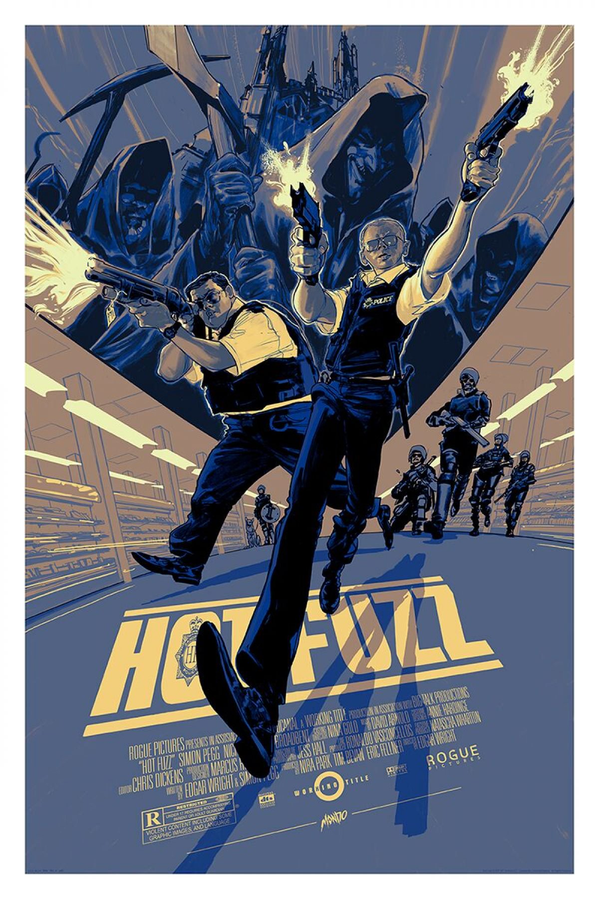 The next batch was revealed on Birth Movies Death. There's a slick Samurai Jack (and a colored variant) by Methane Studios and a very fun Predator pin, but my heart is won by Rich Kelly's Hot Fuzz. Kelly's exaggerated, cartoonish style is a perfect match for Edgar Wright's outsized filmmaking: bombastic, broad, and gleeful in how it distorts the familiar.