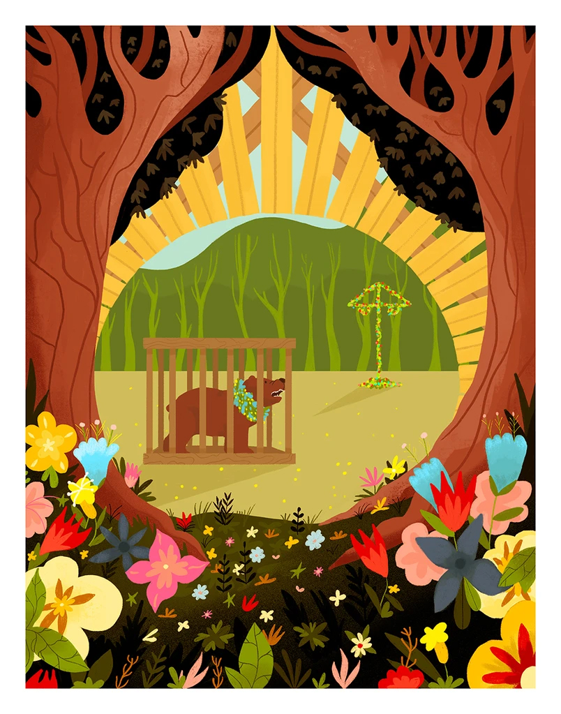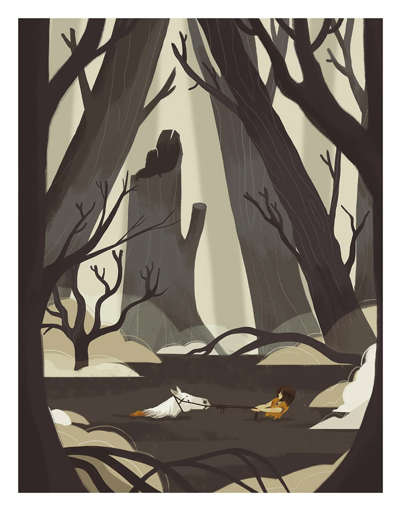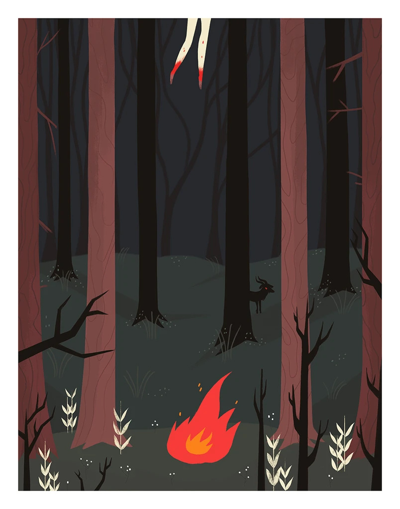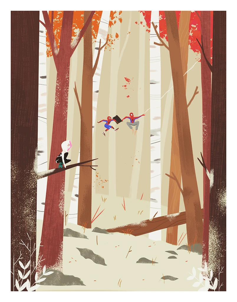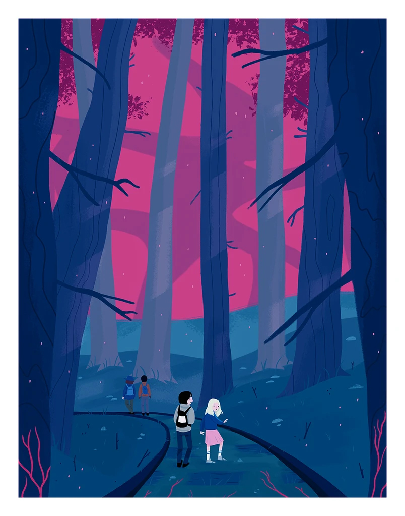 Artist Nan Lawson is best know for her Meet Cute series of artwork featuring some of our favorite couples of film and television. Her work has a dreamy sort of quality to it with a unique illustration style and use of color. But her latest show, Through the Woods at Gallery 1988, has pulled back from the Meet Cute portraits she's known for. Instead, she's recreated beloved scenes from various forests in film and television, including moments from Logan, Midsommar, Stranger Things, Spider-Man: Into the Spider-Verse, The Witch, Lord of the Rings, and more. Check out some of Nan Lawson's Through the Woods art show below.